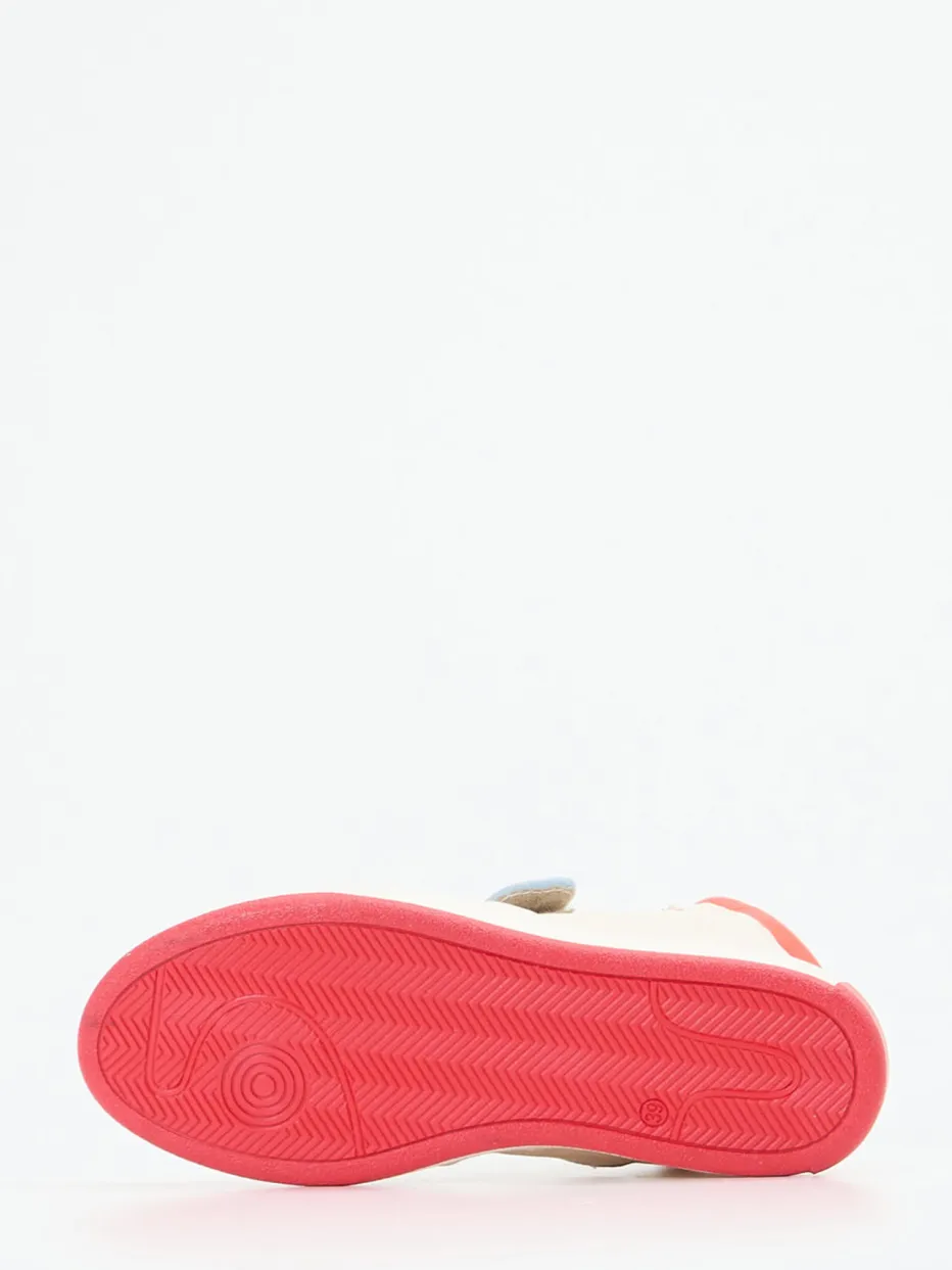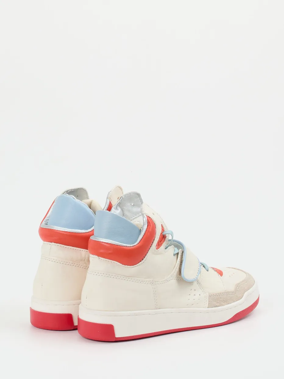 Y2K trifft Streetstyle.Die Marke Andrea Sabatini präsentiert einen modischen High-Top Sneaker. Ob beim Stadtbummel oder Festivalbesuch – dieser Sneaker verbindet Komfort mit ausdrucksstarkem Design. Das soft verarbeitete Kalbleder zeigt sich in edlem Cremeweiß mit glatter Oberfläche und samtigen Veloursleder-Overlays. Hellblaue und rote Akzente sorgen für ein lebendiges Colorblocking, während perforierte Details und ein gepolsterter Schaft den Tragekomfort unterstreichen. Klettverschluss und Schnürung sorgen für funktionalen Halt. Der Look ist inspiriert vom Retro-Basketball-Stil im aktuellen Y2K-Trend. Ein ausdrucksstarker Begleiter für urbane Styles mit Charakter.