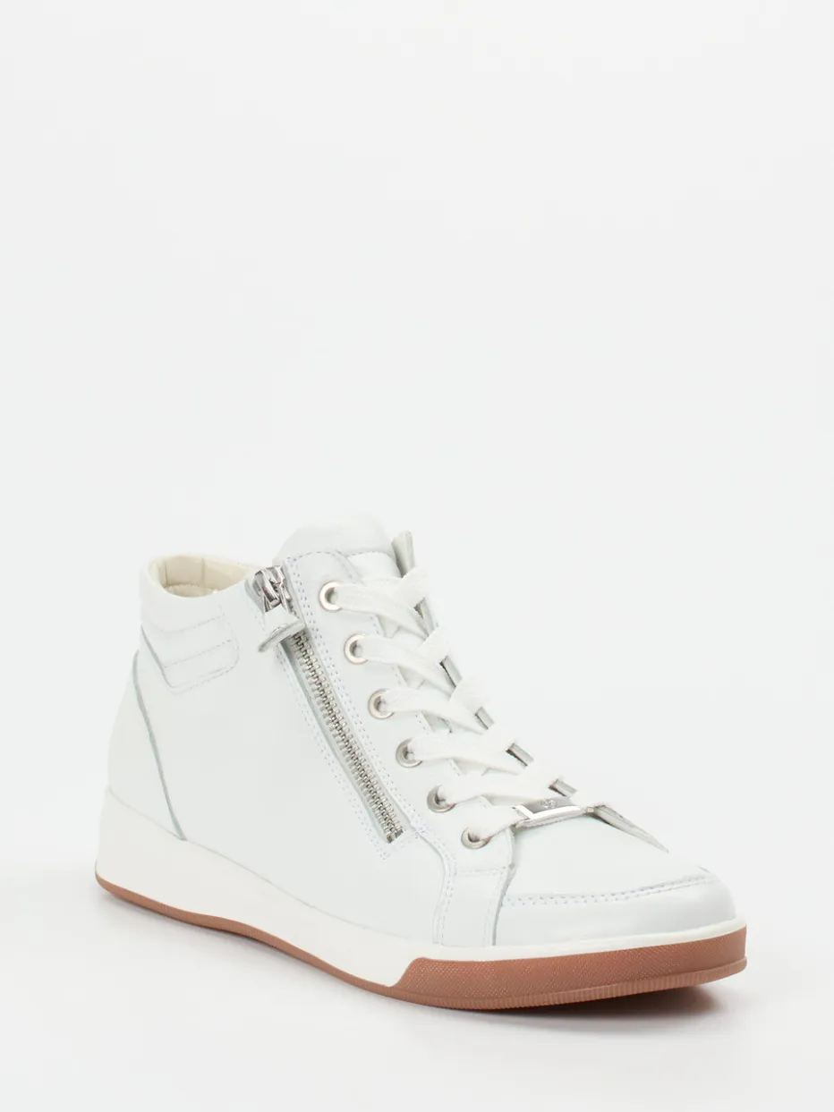 Softness trifft auf sportive Linien.Dieser High-Top-Sneaker von Ara vereint Komfort und cleane Ästhetik auf zeitgemäße Weise. Für entspannte Tage auf den Beinen sorgt das hochwertige, genarbte Kalbleder in Offwhite. Der knöchelhohe Schnitt garantiert Stabilität, während sich durch die Kombination aus Schnürung und silbernem Reißverschluss ein unkompliziertes An- und Ausziehen ergibt. Eine hellbraune Gummisohle mit strukturierter Profilierung sorgt für Trittsicherheit. Polsterung am Einstieg, weiches Frottee-Futter und ein herausnehmbares Fußbett bieten ein angenehmes Tragegefühl. Trendig im Streetwear-Kontext inszenierbar, besonders stilvoll zu Jogpants oder weißer Crossbody-Bag. Ara vereint gekonnt Alltagstauglichkeit mit durchdachtem Komfortdesign.