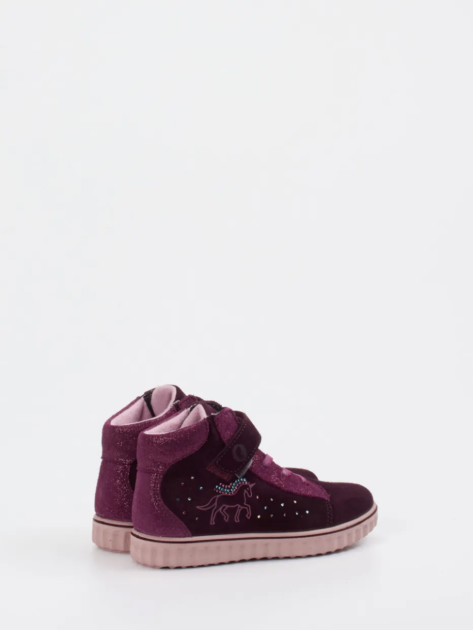 Magie trifft Alltagstauglichkeit.Der Ricosta-Kindersneaker kombiniert fantasy-inspiriertes Design mit funktionaler Alltagstauglichkeit. Ideal für den Weg in die Kita oder zum Spielen draußen: Das Modell besteht aus hochwertigem Veloursleder mit samtig-matter Oberfläche und punktet mit einem knöchelhohen Schnitt. Die Hauptfarbe Brombeere wird durch Altrosa- und Hellrosa-Akzente ergänzt. Glitzernde Details an Lasche und Ferse sowie eine Einhorn-Stickerei mit Strass unterstreichen den fantasievollen Look. Die flexible PU-Sohle sorgt für Rutschfestigkeit, Klettverschlüsse erleichtern das Anziehen. Ein Schuh im Trend aktueller Glitzer- und Fantasy-Elemente, ideal für kleine Träumerinnen. Ricosta-typisch überzeugt das Modell durch kindgerechte Passform und robuste Verarbeitung.