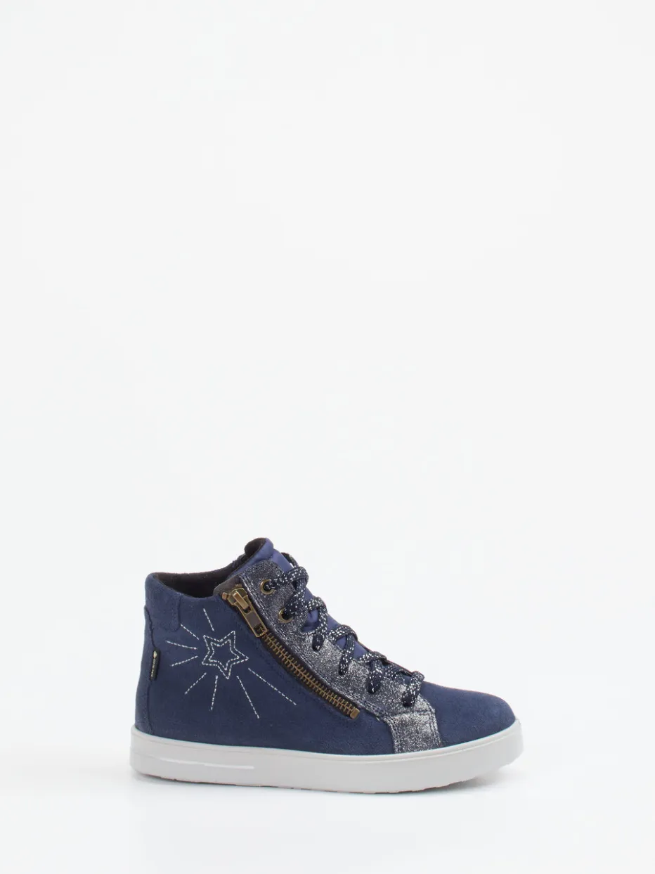 Glitzer trifft Komfort in dunklem Blau.Superfit präsentiert einen modischen High-Top-Sneaker für Kinder mit stilsicherem Design. Für Spielplatz, Schultag oder entspannte Nachmittage: Das Modell aus samtig angeschliffenem Veloursleder in Dunkelblau kombiniert Strapazierfähigkeit mit weichem Textilfutter. Optische Highlights wie Glitzerelemente entlang der Schnürung und eine seitliche Sternen-Stickerei unterstreichen den jugendlich urbanen Stil. Der seitliche Reißverschluss erleichtert das An- und Ausziehen und die PU-Sohle mit sternförmigem Profil sorgt für trittsicheren Halt. Inspiriert von Y2K- und Streetwear-Trends passt das Modell ideal zu Leggings oder Jeansjacke. Ein stylisches Kinderschuh-Modell mit durchdachtem Tragekomfort für jeden Tag.
