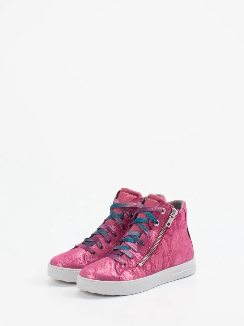 Dieser High-Top von Superfit kombiniert strukturiertes Veloursleder mit glänzenden Akzenten – ein echtes Style-Statement für trendorientierte Looks.
