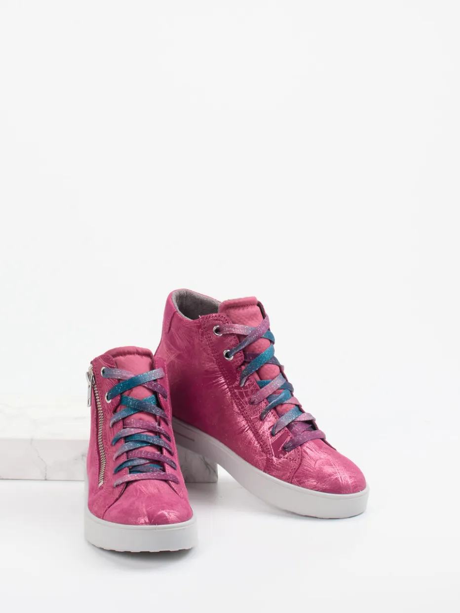 Y2K-Style für junge Trendsetter.Superfit zeigt mit diesem Damen-High-Top-Sneaker ein modisches Highlight in der Kategorie Schnürboot. Ideal für urbane Freizeitmomente oder Ausgehgelegenheiten verbindet der knöchelhohe Sneaker pinkfarbenes Veloursleder mit matt glänzender Strukturprägung. Die robuste PU-Sohle trägt ein sternenförmiges Profil, während ein silberner Reißverschluss mit changierenden Schnürsenkeln für hohen Tragekomfort sorgt. Petrol- und Weißtöne ergänzen das auffällige Color-Blocking. Streetwear trifft Y2K-Trend – perfekt abgestimmt auf einen jungen, expressiven Stil und metallicfarbene Accessoires. Superfit vereint Designpower mit kindgerecht bequemer Qualität.