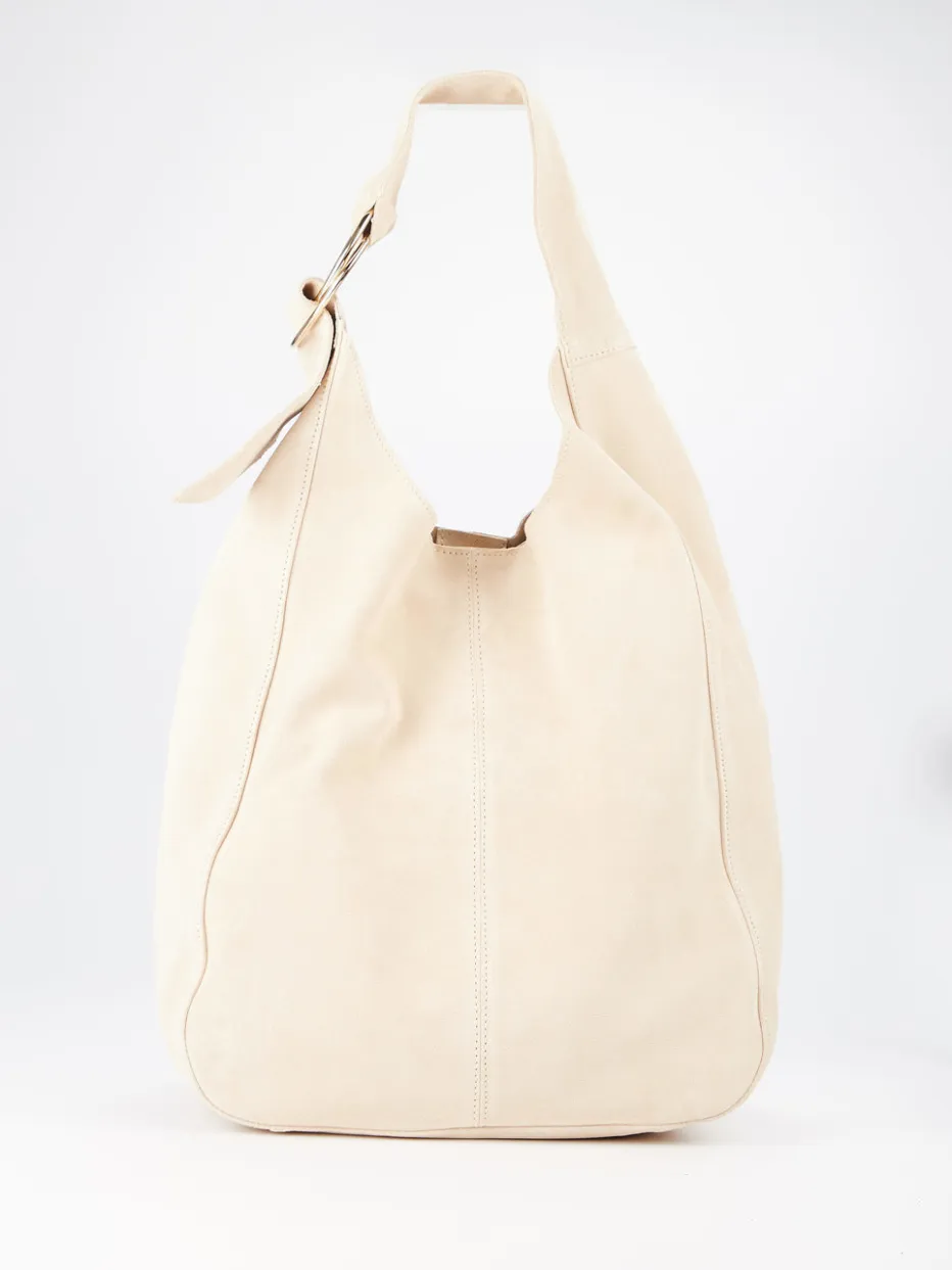 Cremig-beiger Velours trifft auf minimalistisches Design und goldene Akzente – diese Hobo Bag verbindet Soft-Luxury mit modernen Formen.