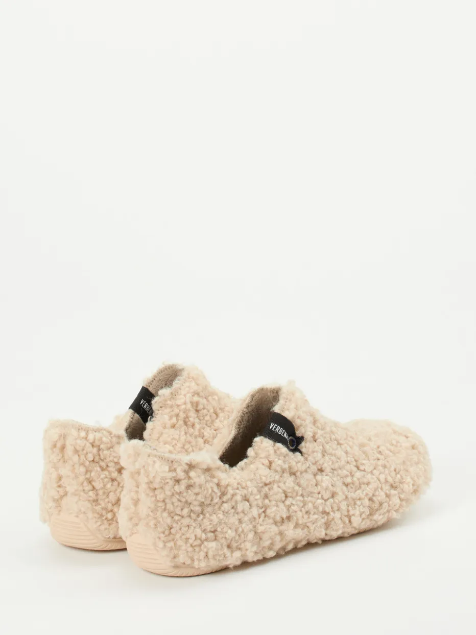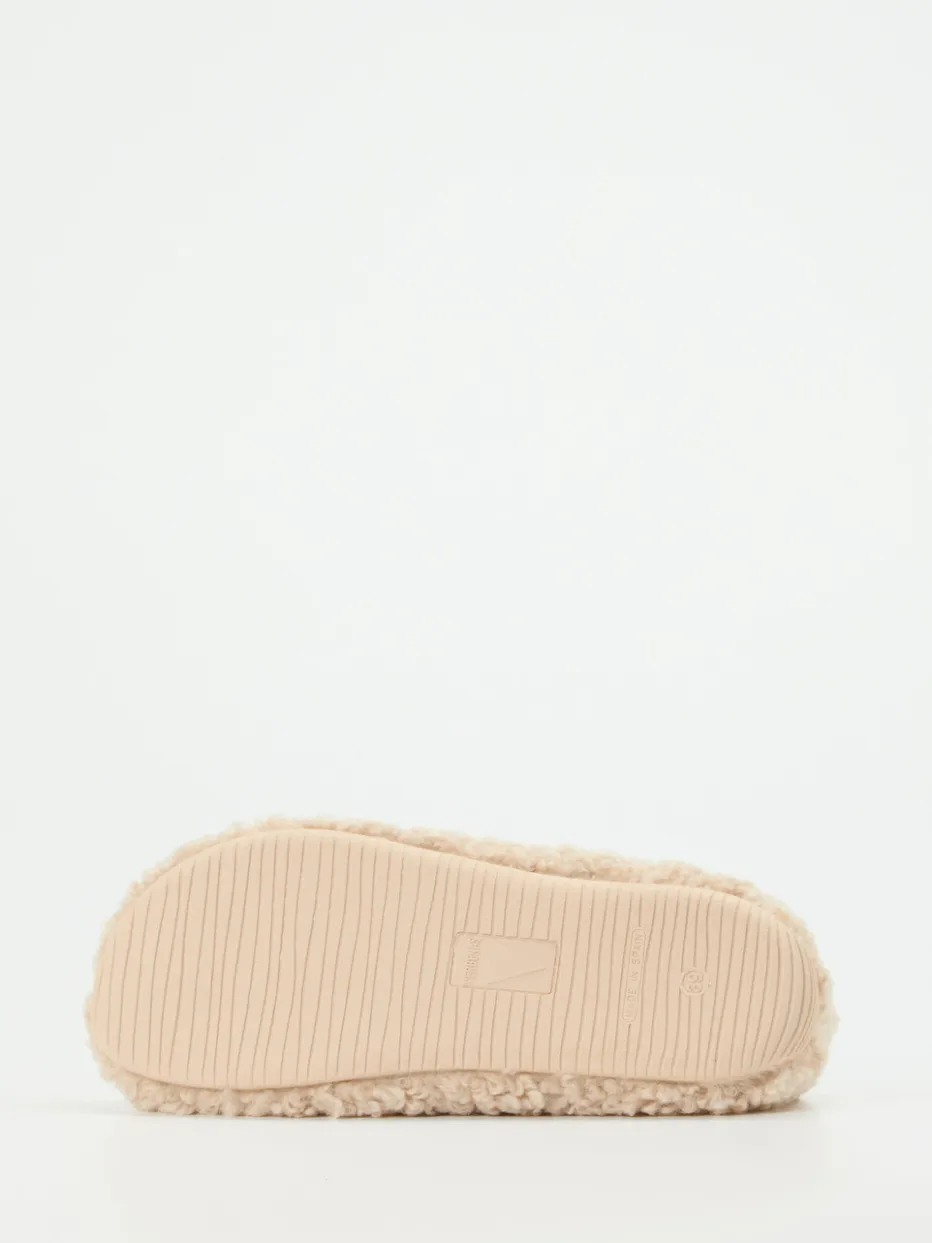 Ideal für entspannte Momente daheim überzeugt das Modell durch sein samtweiches Obermaterial aus Textil in floriger Teddy-Fleece-Optik. Das Cremebeige unterstreicht zusammen mit der abgerundeten Silhouette den ruhigen, minimalistischen Look. Ein elastischer Einstieg sorgt für leichtes An- und Ausziehen, während die profilierte Gummisohle sicheren Halt auf allen Innenflächen bietet. Scandi-inspirierte Loungewear und der Cocooning-Trend der Saison machen den Schuh zum stilvollen Begleiter für gemütliche Stunden. Harmoniert besonders gut mit weichen Loungewear-Teilen in Naturtönen.