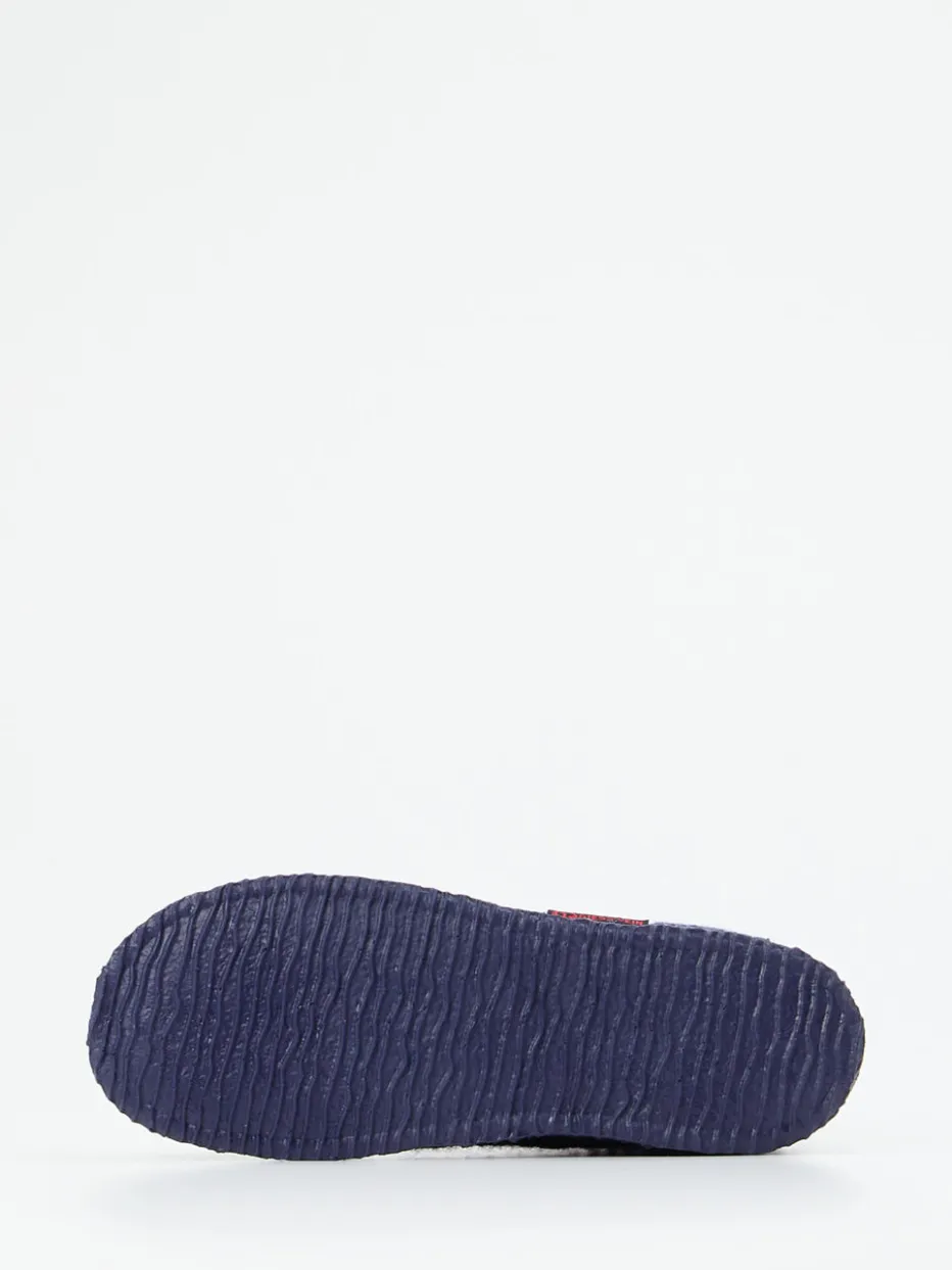 Dank wärmendem Wollwalk bietet der Schuh ein ausgeglichenes Fußklima, während die samtig-filzige Oberfläche einen gemütlichen Eindruck hinterlässt. Der dunkelblaue Grundton mit hellblauer Fersenzone wirkt dezent lebendig. Der gestrickte Schaftabschluss und der sockenähnliche Einstieg ermöglichen unkompliziertes Anziehen und besten Halt. Die rutschfeste, naturkautschukbasierte Gummisohle unterstreicht den funktionalen Charakter. Die minimalistische Form passt perfekt zu entspannter Loungewear.