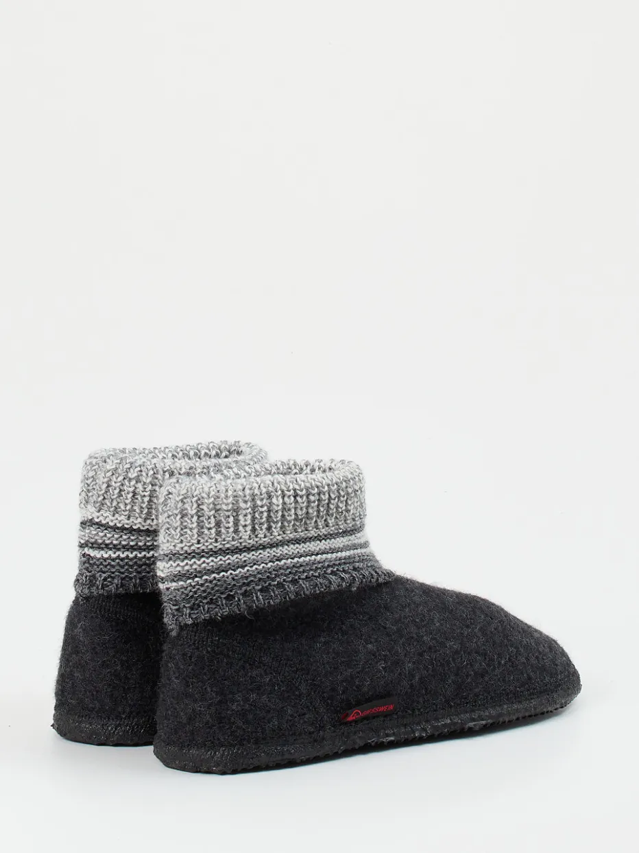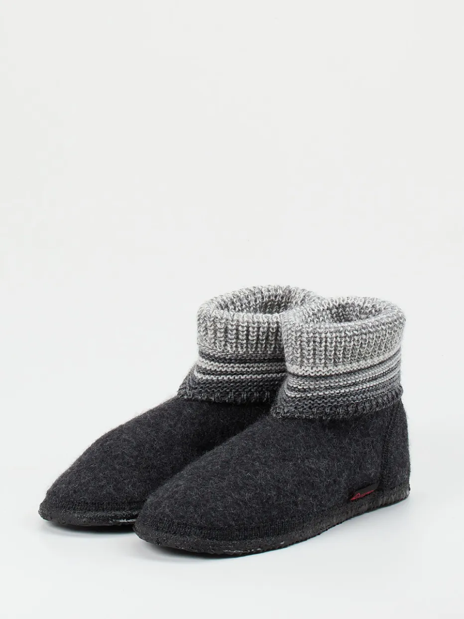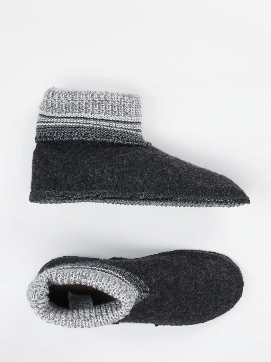 Warm durch den Winter.Giesswein präsentiert mit diesem Hüttenschuh einen klassischen Begleiter für entspannte Momente daheim. Ideal für kalte Böden: Der Schuh aus dunkelgrauem Wollfilz, samtig-filzig im Griff, bietet ein ausgeglichenes Fußklima. Ein elastischer, weiß-grau-schwarz gestreifter Strickbund in sockenähnlicher Silhouette umschließt den Knöchel behaglich. Die flexible Naturkautschuksohle ist leicht profiliert und sorgt für sicheren Halt – auch auf glatten Oberflächen. Das Design greift alpine Loungewear-Elemente auf und passt perfekt zum Cozy-Comfort-Trend der Saison. Harmoniert ideal mit Strick- oder Fleecekleidung. Ein relaxter Klassiker mit langlebiger Naturmaterial-Qualität – typisch Giesswein.