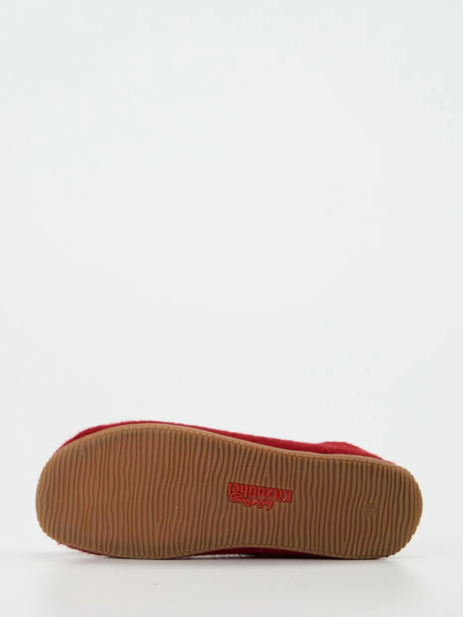 Der dunkelrote Hüttenschuh aus Wollfilz kombiniert alpeninspirierte Ästhetik mit funktionalem Komfort – ideal für stilvolle Ruhephasen zu Hause.
