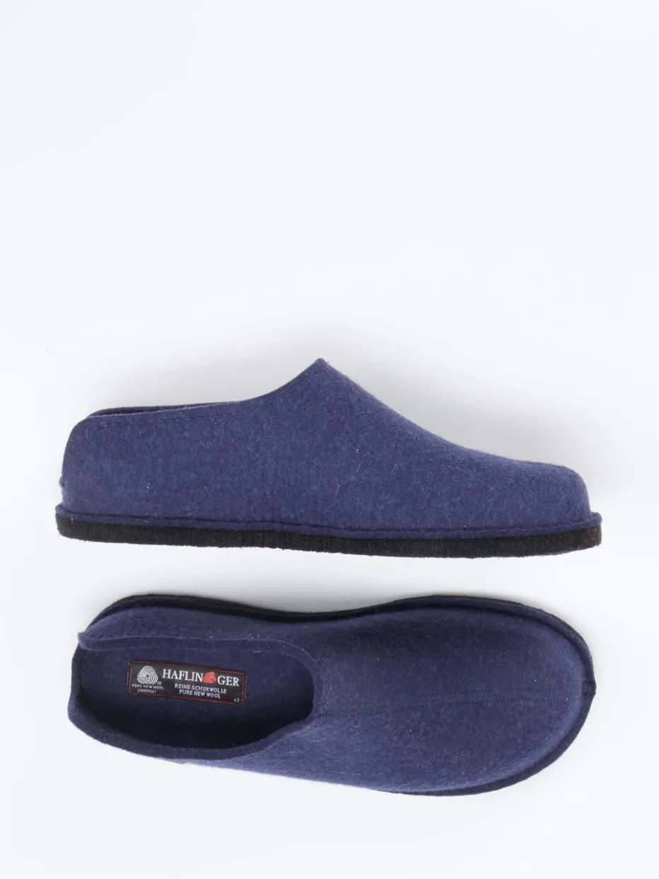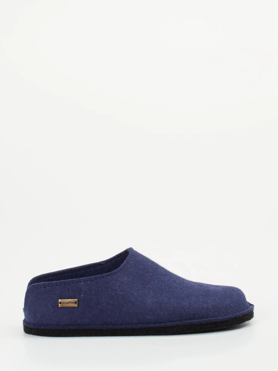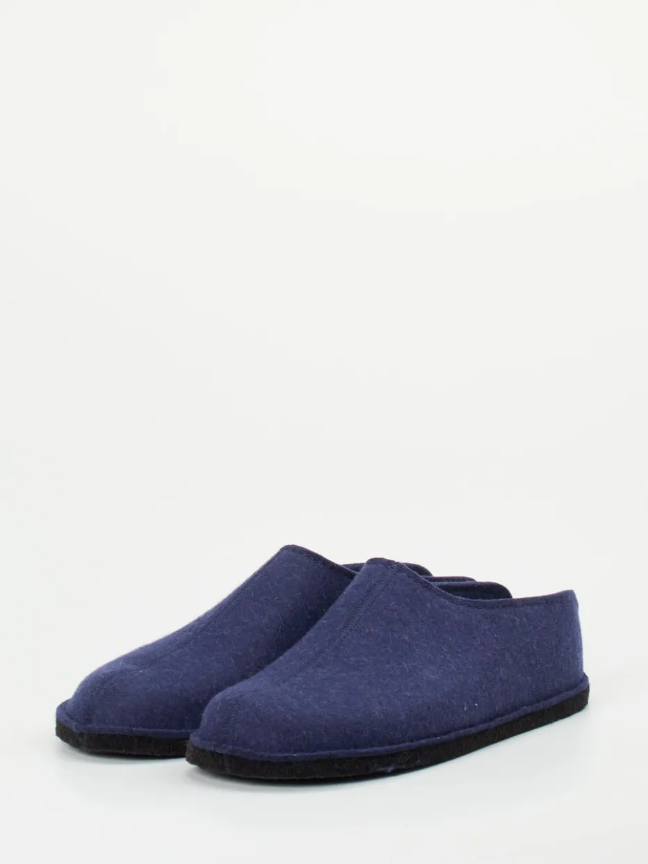 Ideal für gemütliche Abende zu Hause bietet dieser geschlossene Slip-on aus dunkelblauer, gewalkter Schurwolle einen warmen und atmungsaktiven Tragekomfort. Die matt strukturierte Oberfläche, kombiniert mit einem ergonomischen Schnitt und einer rutschhemmenden Filzsohle mit Latexbeschichtung, unterstreicht den funktionalen Anspruch. Die klassische Form mit rund zulaufender Vorderkappe und dezentes Metall-Emblem verleihen dem Modell einen reduzierten skandinavischen Stil. Lässt sich perfekt mit Wollsocken und Loungewear kombinieren.
