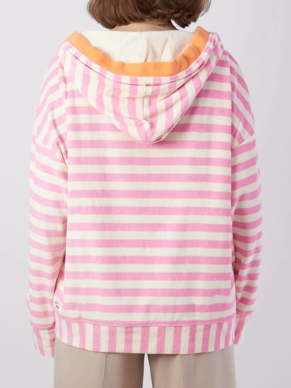 Dieser weiche Frottee-Hoodie in Pastellstreifen bringt Y2K-Vibes in entspannte Freizeitlooks – mit verspielter Chenille-Stickerei und kontrastfarbenen Details.