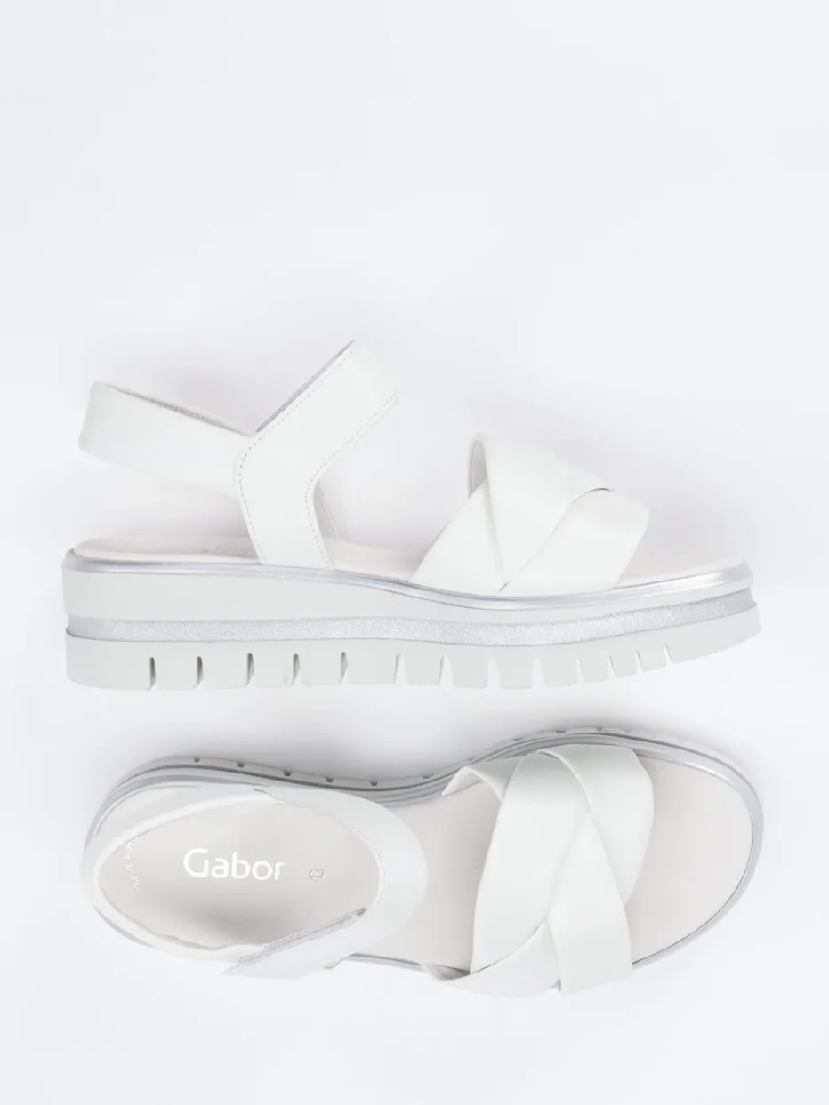 Minimalistisch trifft auf Metallic.Die Marke Gabor präsentiert mit dieser Keilsandalette aus weißem Lammleder eine stilvolle Option für Alltag und Urlaub. Weich verschlungene Riemen und ein regulierbarer Klettverschluss bieten individuellen Komfort. Das matte Leder kombiniert sich mit einer breiten, offengeführten Silhouette und silberfarbenem Zierstreifen an der profilierten Gummisohle – ein klares Bekenntnis zum Minimalismus-Trend mit Metallic-Akzent. Die gepolsterte Innensohle sorgt für angenehmen Tragekomfort, während die dezente Plateauoptik modernen Schwung verleiht. Ideal zu fließenden Stoffhosen oder urbanen Sommeroutfits. Gabor-Komfort in zeitlos-puristischem Design mit modischer Raffinesse.