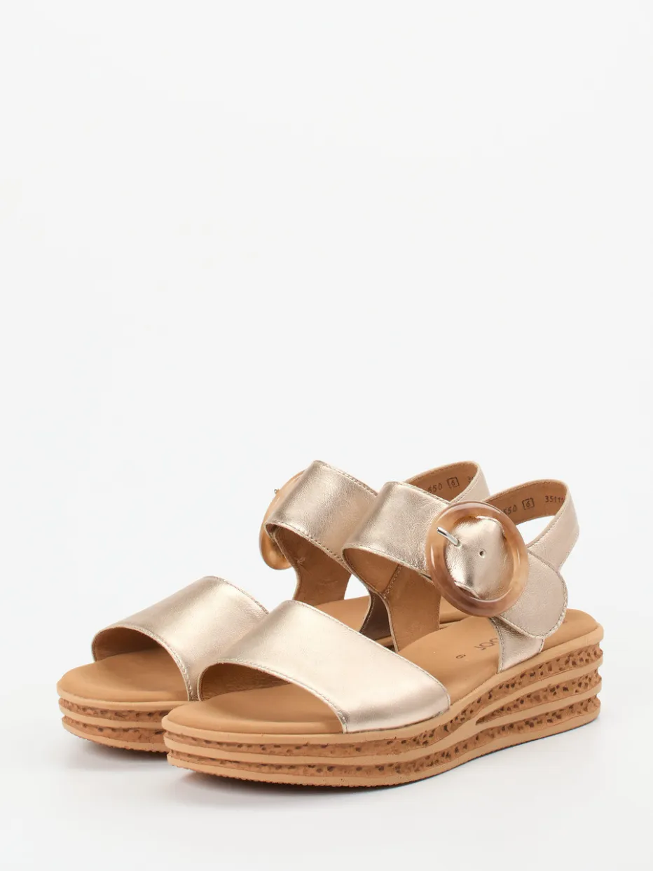 Glanzvoll durch den Sommer.Die Gabor Keilsandalette gehört zur Damenkollektion und bietet eine modische Lösung für aktive Sommertage. Mit goldfarbenem Metallicleder und glänzender Oberfläche zieht dieses Modell die Blicke auf sich. Die breite, ergonomisch geformte Silhouette mit mehrschichtiger Plateausohle sorgt nicht nur für Trendbewusstsein, sondern auch für ein angenehmes Laufgefühl. Eine bernsteinfarbene, transluzente Schließe aus Kunststoff ermöglicht individuellen Halt. Der Stil ist vom Retro-Chic der 70er Jahre inspiriert und passt sich aktuellen Metallic- und Komfort-Trends an. Ideal zum Leinenkleid oder zur Strohtasche – für sommerlich elegante Freizeitlooks mit besonderem Flair.