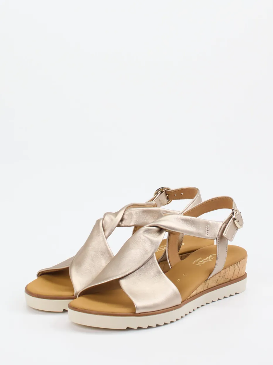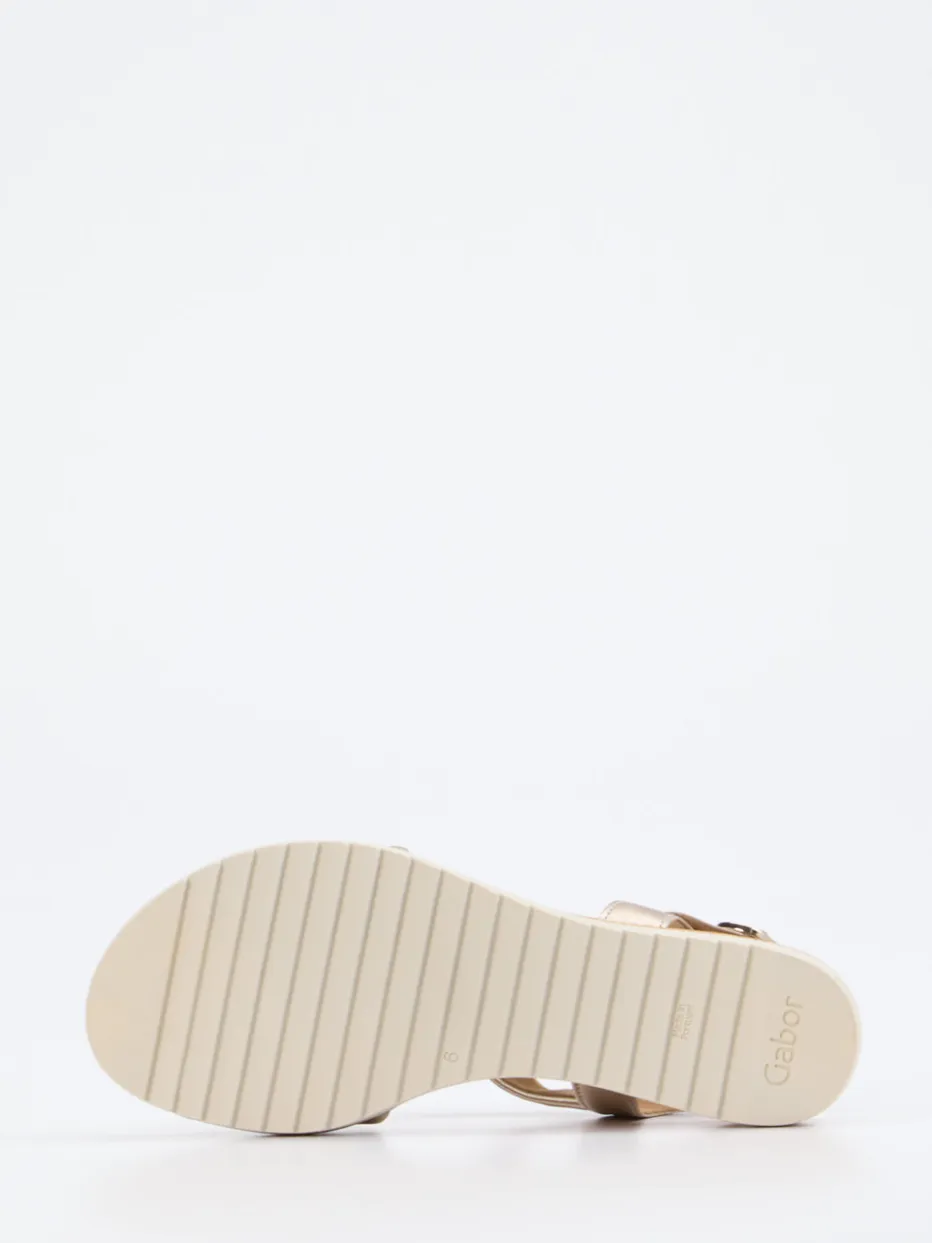 Die Gabor Comfort Keilsandalette kombiniert weiches Metallicleder in Champagner-Beige mit ergonomischem Korkfußbett für gehobenen Sommerkomfort.