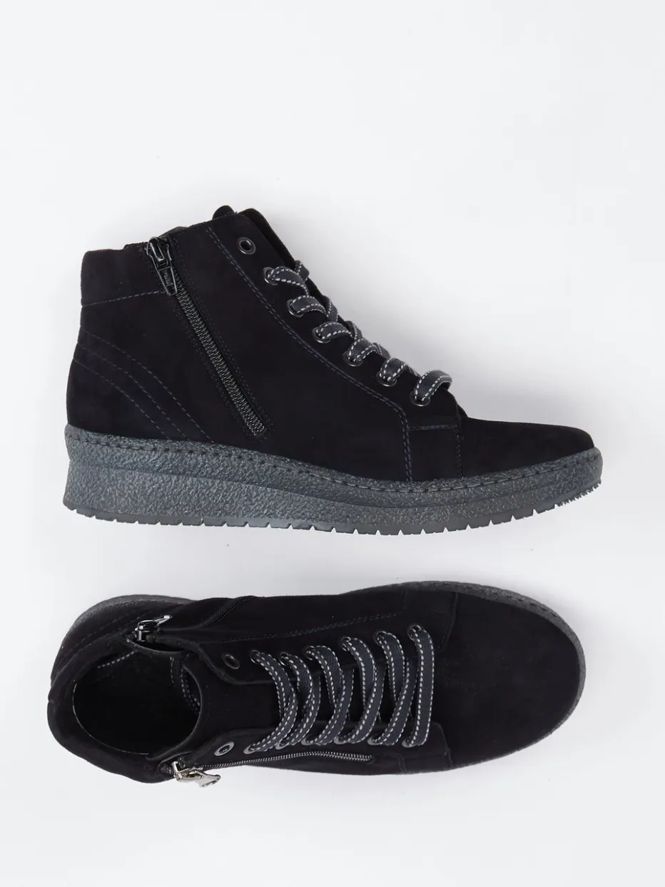 Stilvoll durch kühle Tage.Die Marke Semler präsentiert mit diesen Keilsohlen-Boots ein herbsttaugliches Allround-Modell für Damen. Ideal bei wechselhaftem Wetter in der City oder auf entspannten Spaziergängen bietet dieser Schnürboot aus softem Veloursleder eine matte Oberfläche in tiefem Blau. Die Kombination aus Schnürung und seitlichem Reißverschluss erleichtert das Anziehen, während die profilierte Gummisohle mit dezentem Keilabsatz für Trittsicherheit sorgt. Silberfarbene Ösen und Kontrastnähte unterstreichen den cleanen Streetwear-Charakter. Die austauschbare Innensohle fördert den Komfort besonders für Einlagen, was vor allem bei längeren Strecken ein Pluspunkt ist. Kombiniert mit Jeans oder Thermoleggings wirkt der Look funktional und modern. Perfekt ausbalanciert zwischen Komfortanspruch und urbanem Anspruch.
