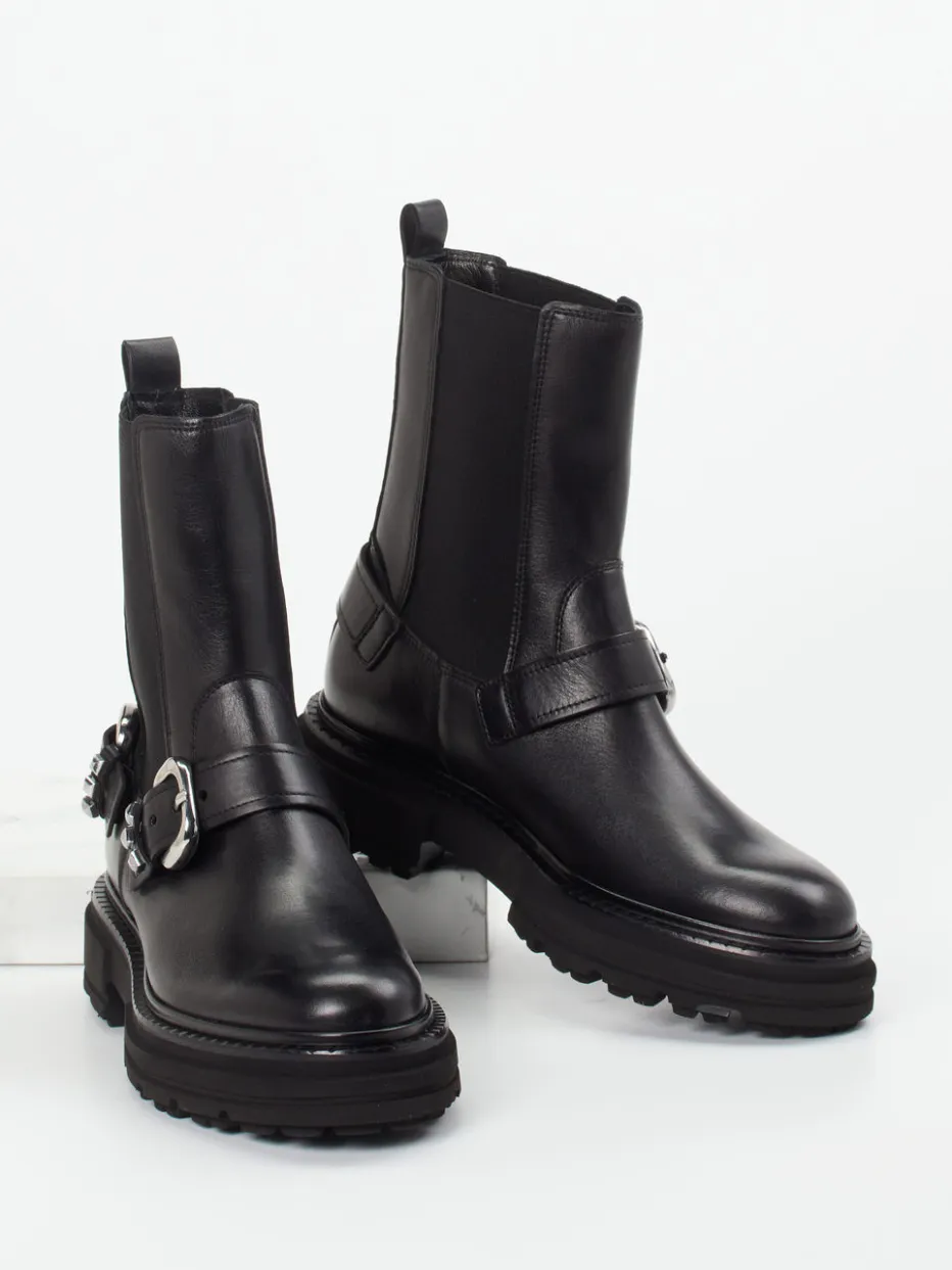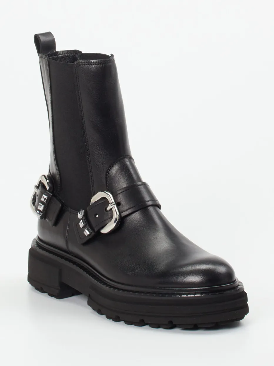 Diese Stiefeletten vereinen edles, glänzendes Kalbleder mit markanten Hardware-Details. Ein modisches Statement-Piece für trendorientierte Looks mit urbanem Anspruch.