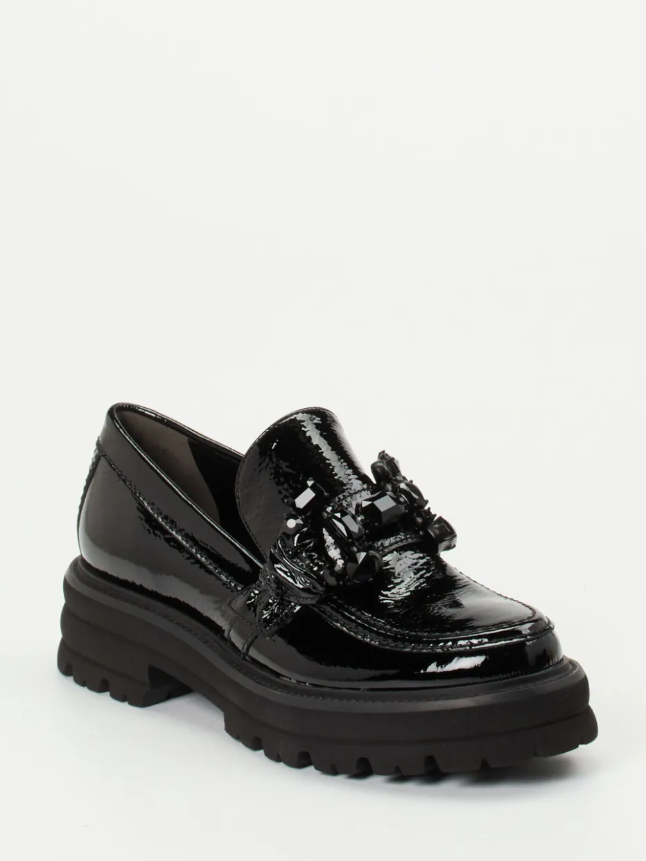 Dieser Slipper verbindet glänzendes Lackleder mit robuster Profilsohle und expressiven Schmuckdetails – ein stilbewusstes Statement für urbane Looks.