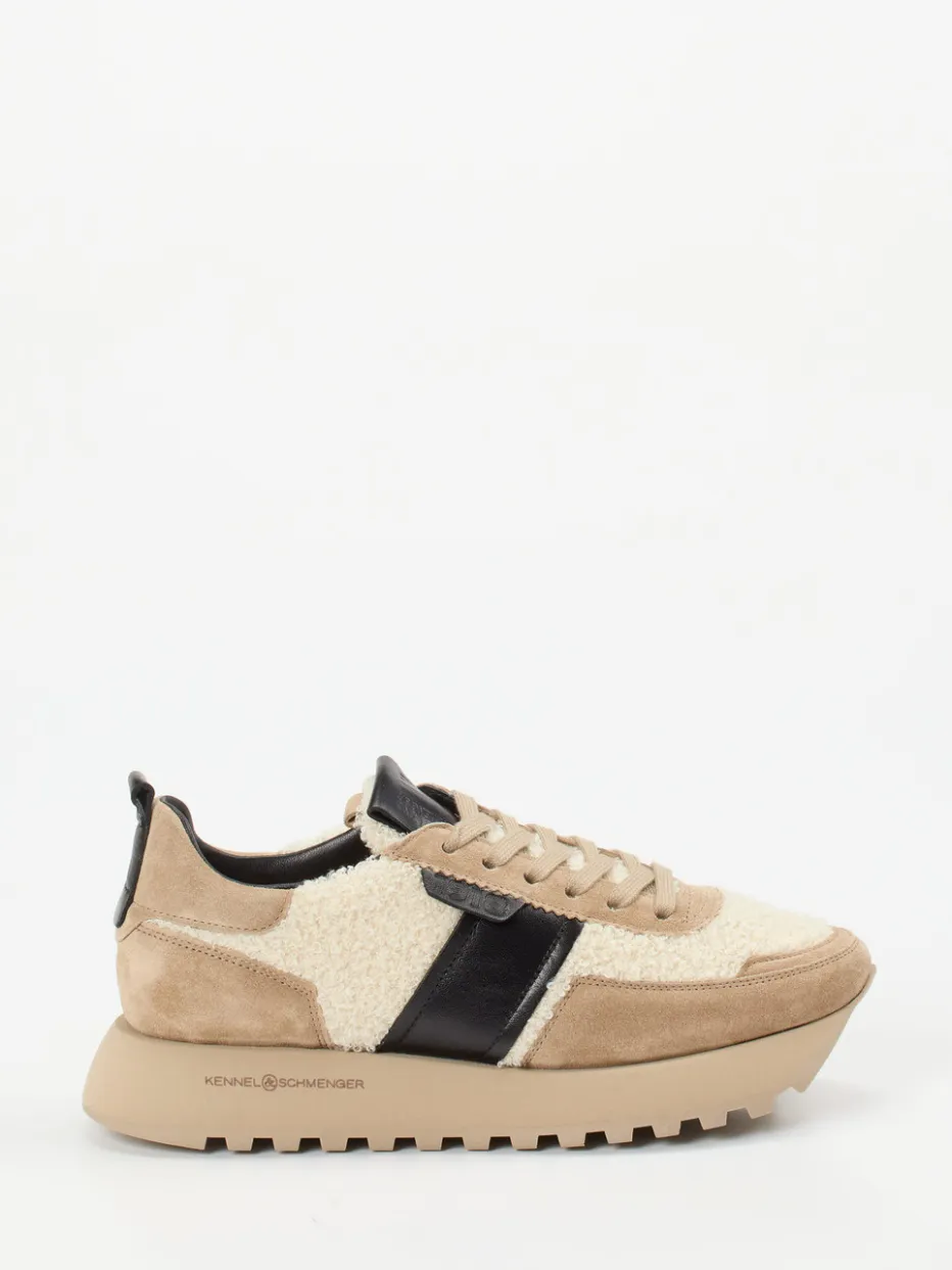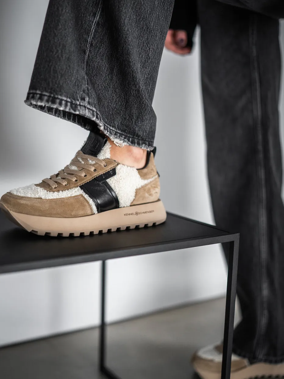 Statement-Piece mit Retro-Charakter.Kennel & Schmenger interpretiert den Damen-Sneaker mit stilistischer Raffinesse. Ideal für entspannte City-Looks bietet dieser Chunky Sneaker mit Veloursleder und Teddytextil haptisch wie optisch echte Highlights. Beigefarbene Töne dominieren den Look, während schwarze Glattleder-Elemente für markante Kontraste sorgen. Die retroinspirierte, voluminöse Sohle aus Gummi vereint Style mit Funktionalität und steht für den angesagten Chunky-Trend. Logo-Prägungen und die Zuglasche setzen dezente Brand-Akzente. Ein trendbewusster Komfortschuh mit moderner Ausstrahlung – präzise gefertigt von Kennel & Schmenger.