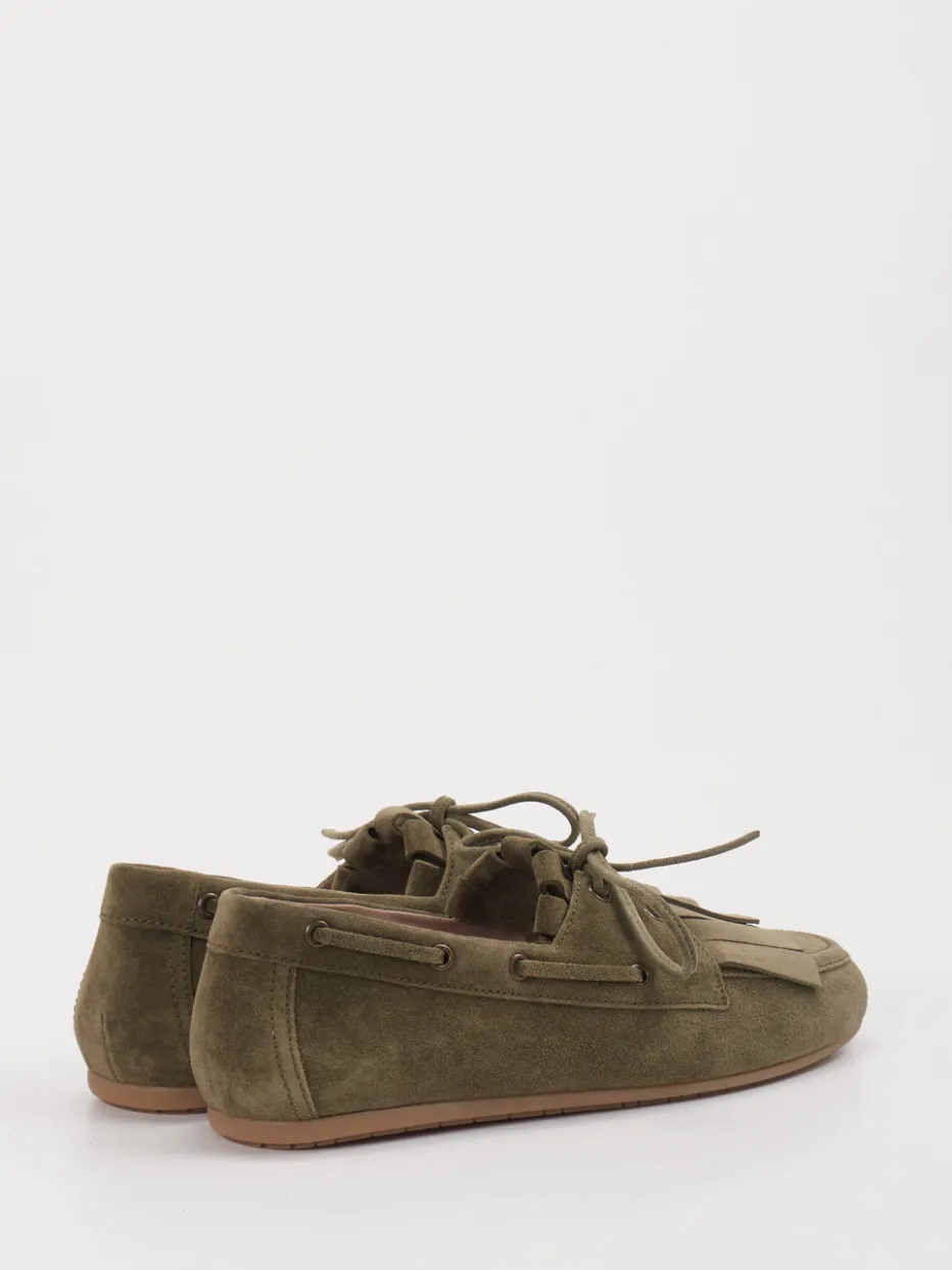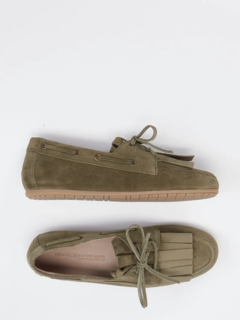 Preppy-Design trifft natürlichen Luxus. Kennel & Schmenger präsentiert mit diesem Damen-Loafer eine stilvolle Interpretation des Bootsschuhs. Ideal für Bürosettings oder den gehobenen Alltagslook wirkt das olivgrüne Veloursleder zeitlos elegant. Eine matt strukturierte Oberfläche, tonale Nähte und eine Fransenlasche mit Schnürung samt Metallösen unterstreichen die klassische Silhouette. Die profilierte Gummisohle sorgt für angenehmen Laufkomfort und Alltagstauglichkeit. Modisch greift der Schuh den Trend „Quiet Luxury“ auf und harmoniert besonders gut mit hellen Chinos oder Canvas-Taschen in Naturtönen. Ein femininer Klassiker mit moderner Raffinesse und hohem Trageanspruch.
