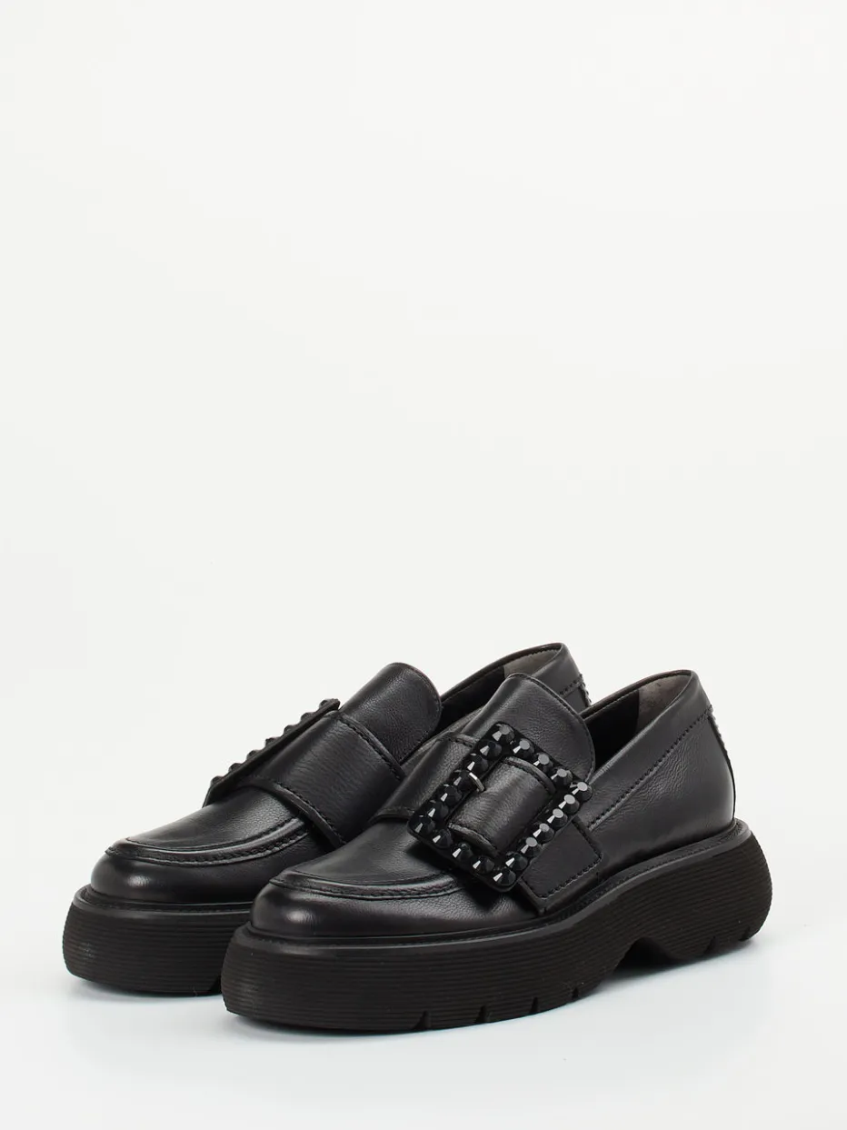 Dieser schwarze Kalbleder-Loafer verbindet minimalistisches Design mit modischer Chunky-Sohle und stilvoller Dekorschnalle. Die ideale Wahl für urbane Looks mit Anspruch.