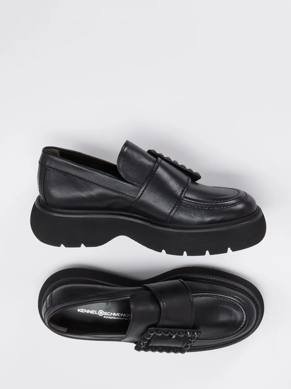 Starke Linien, dezente Opulenz.Kennel & Schmenger präsentiert mit diesem Damen-Loafer ein Modell, das schlichte Eleganz auf moderne Weise interpretiert. Schwarzes Kalbleder mit genarbter Textur und toniger Mokkasinnaht trifft auf eine voluminöse Plateausohle mit markantem Profil. Die edle Dekorschnalle mit schwarzen Schmucksteinen setzt ein modisches Highlight, das den „Quiet Luxury“-Trend aufgreift. Als Schlupfschuh konzipiert, überzeugt der Loafer mit Komfort, während das rutschhemmende Sohlenprofil Alltagstauglichkeit verspricht. Perfekt zu weiten Stoffhosen oder ledernen Handtaschen kombinierbar. Ein charakterstarkes Modell für stilbewusste Looks mit Understatement.