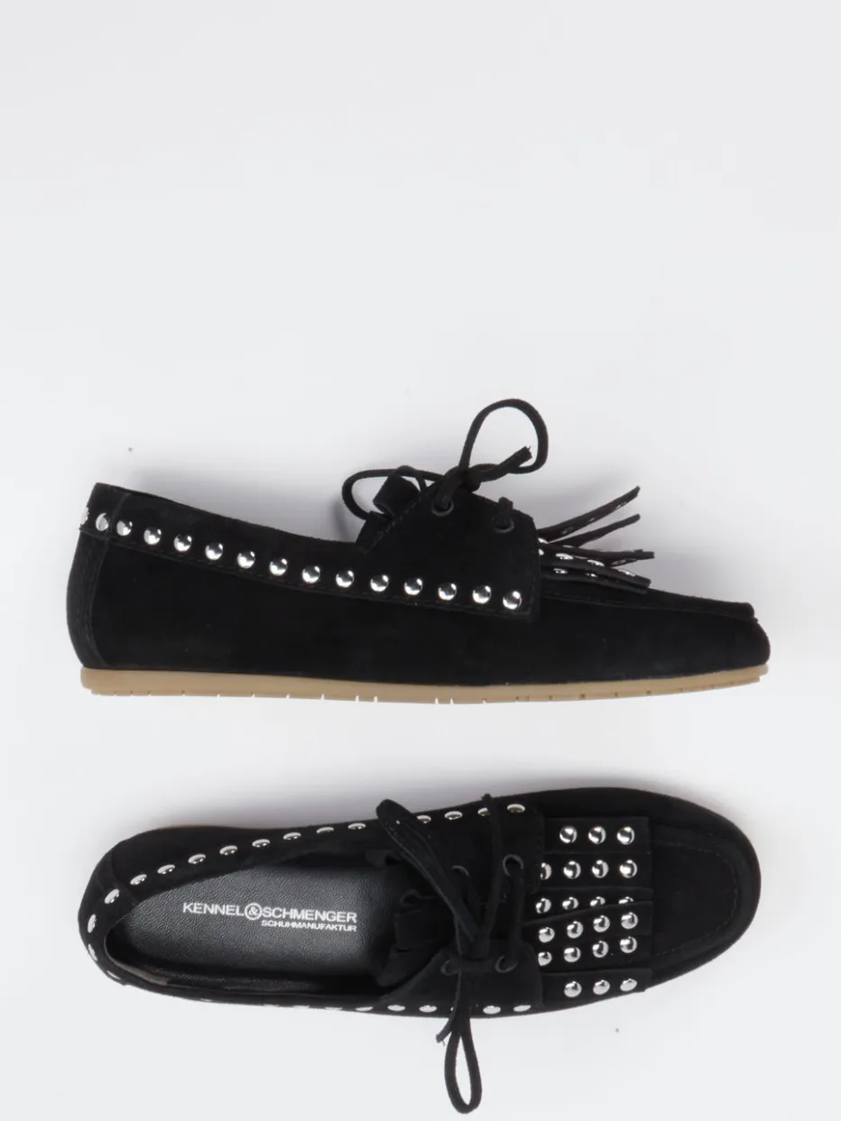 Statement-Look mit Vintage-Vibes. Kennel & Schmenger interpretiert den Mokassin neu und setzt auf ein raffiniertes Spiel aus Material und Detail. Ob beim Ausgehen oder im Alltag – der schwarze Mokassin aus samtigem Veloursleder überzeugt mit flacher, rutschhemmender Gummisohle und femininer Rundsilhouette. Silberfarbene Nieten, eine markante Fransenlasche und tonale Zierschnürung unterstreichen den individuellen Charakter. Die modischen Streetwear-Anleihen treffen auf ein Design, das auch in „Quiet Luxury“-Looks harmoniert. Kombiniert mit einer Lederjacke entstehen stilsichere Outfits mit urbanem Anspruch. Ein expressiver Begleiter mit modischer Aufwertung in ikonischer Handschrift.