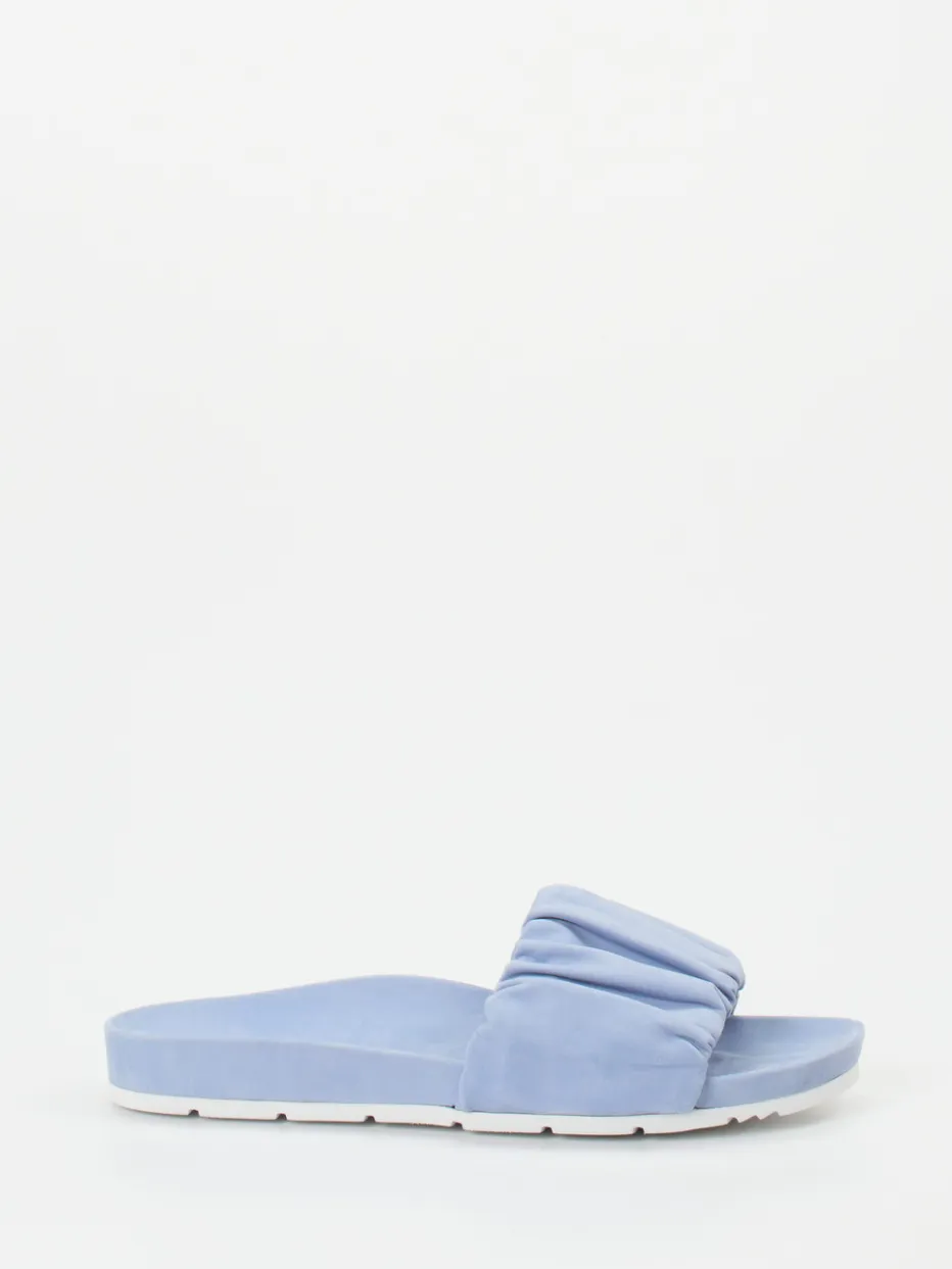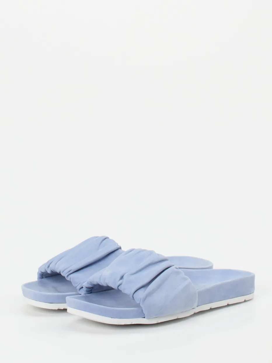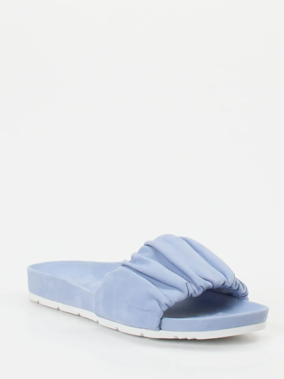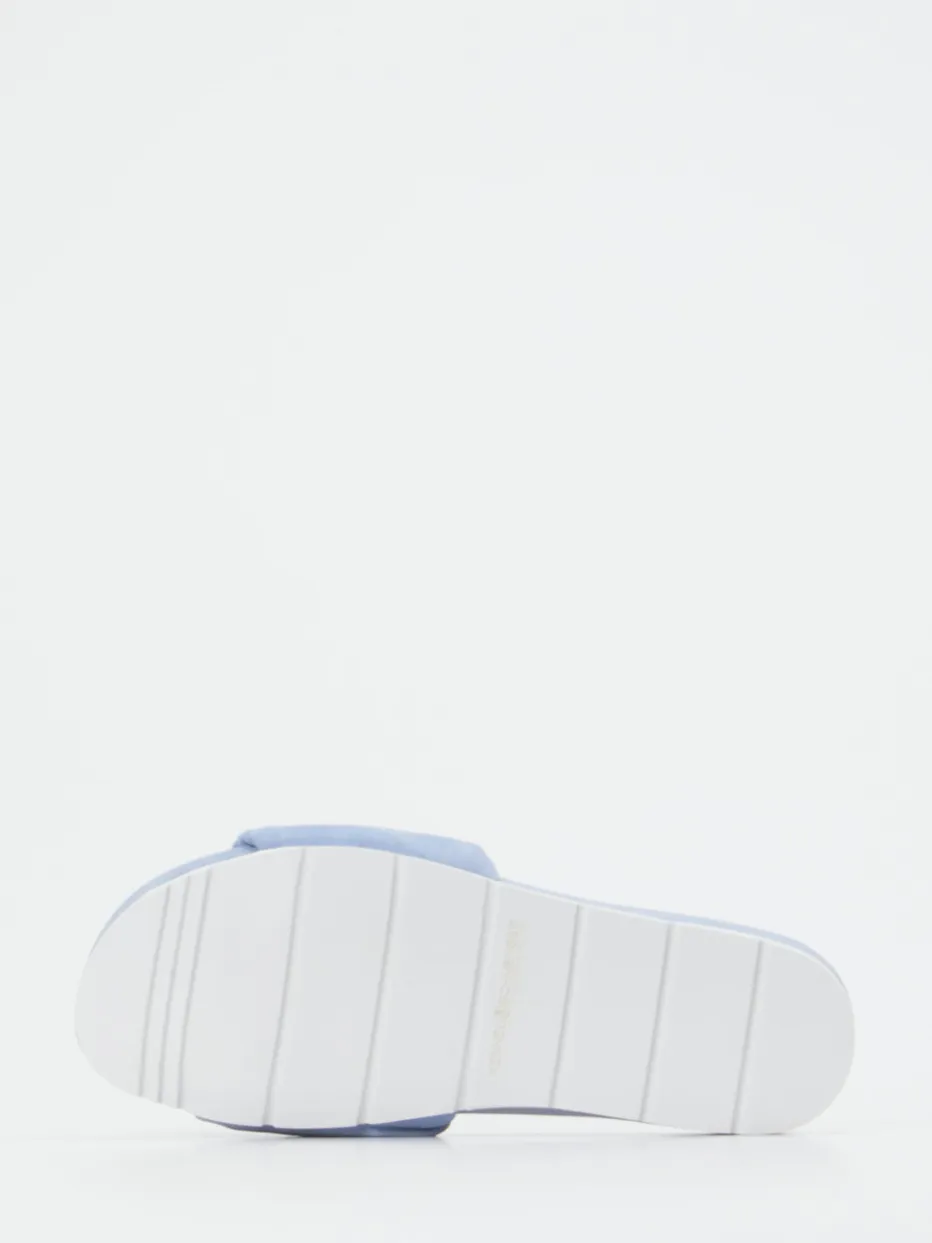 Softes Design trifft Sommerleichtigkeit.Kennel & Schmenger interpretiert Slides neu und präsentiert eine stilvolle Damen-Pantolette aus softem Nubukleder. Ideal für entspannte Sommertage: Das Modell überzeugt mit einem voluminös gerafften Riemen, der durch die hellblaue Farbe sanft zur Geltung kommt. Die matte Oberfläche und Ton-in-Ton-Nähte betonen den minimalistischen Charakter. Eine profilierte Gummisohle sorgt in Kombination mit dem gepolsterten Lederfußbett für angenehmen Tragekomfort – ob zu Hause, beim Stadtbummel oder im Urlaub. Der angesagte Soft-Volume-Trend verleiht dem Look modische Relevanz. Kennel & Schmenger steht bei diesem Modell für stilbewussten Komfort im Premiumsegment.