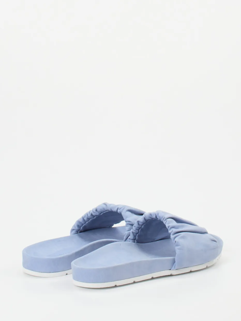 Diese Pantolette verbindet weiches Nubukleder mit einem voluminösen Riemen – ein Ausdruck moderner Nonchalance mit komfortabler Raffinesse.