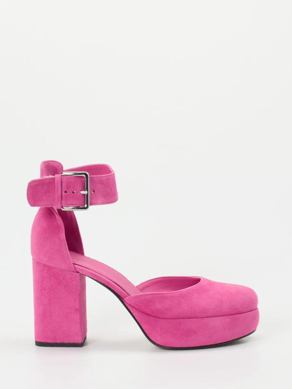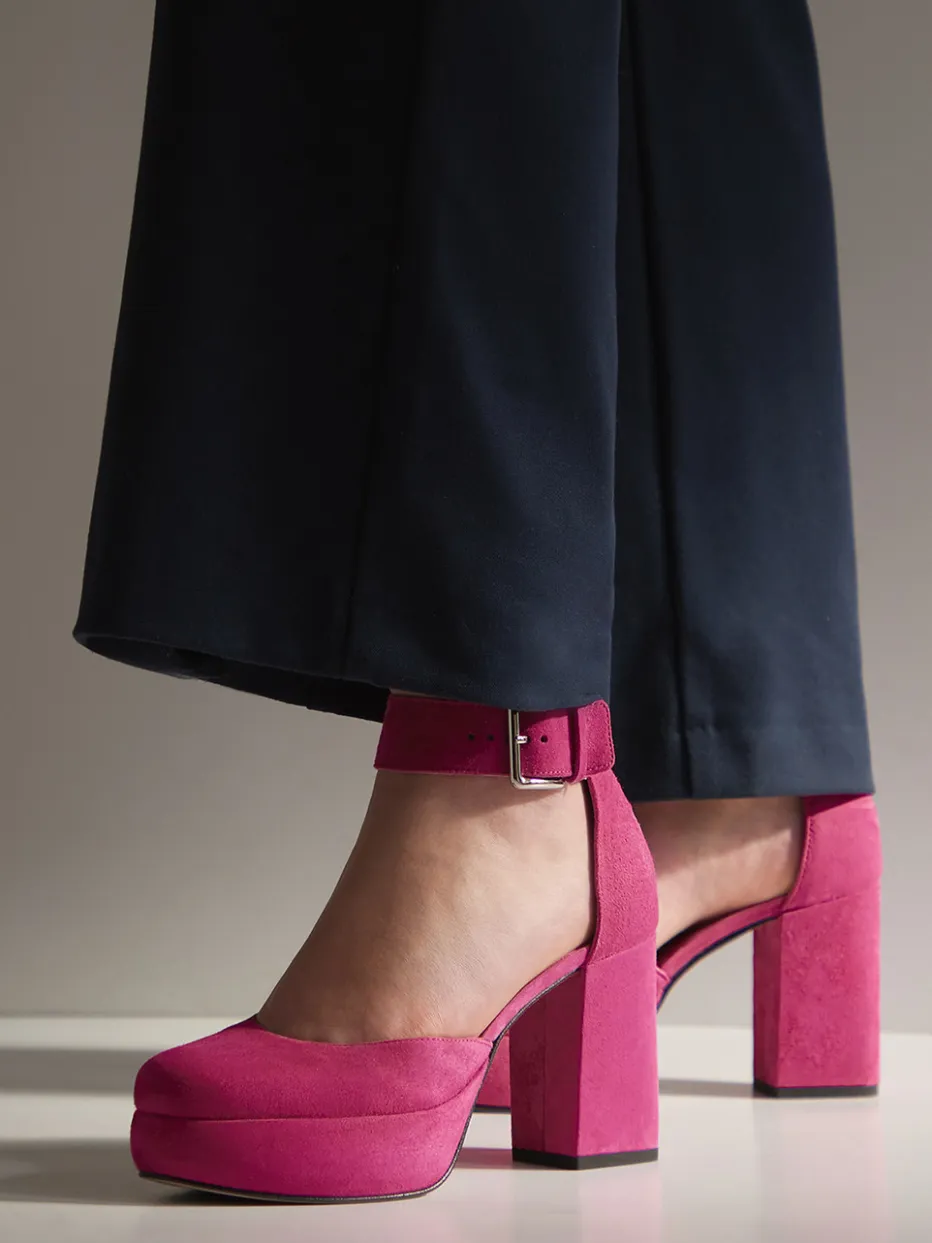 Mit ihrem kräftigen Pink, dem samtigen Veloursleder und dem markanten Blockabsatz interpretieren diese Pumps ein Party-Statement im Stil der 70er neu. Komfort und Stil wirken hier harmonisch zusammen.