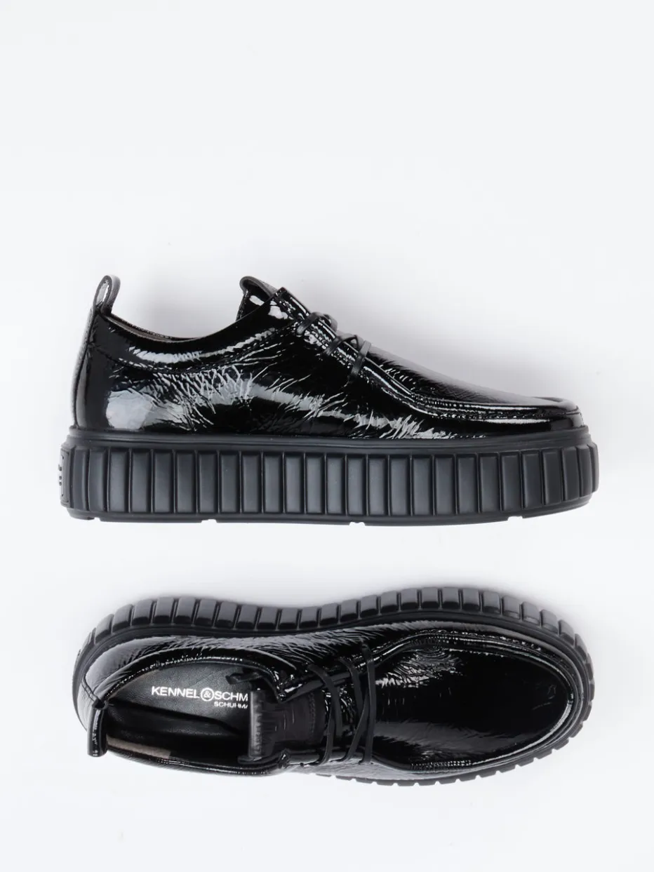 Der Damen-Halbschuh von Kennel & Schmenger ist ein markanter Plateau-Schnürschuh aus schwarzem Lackleder.