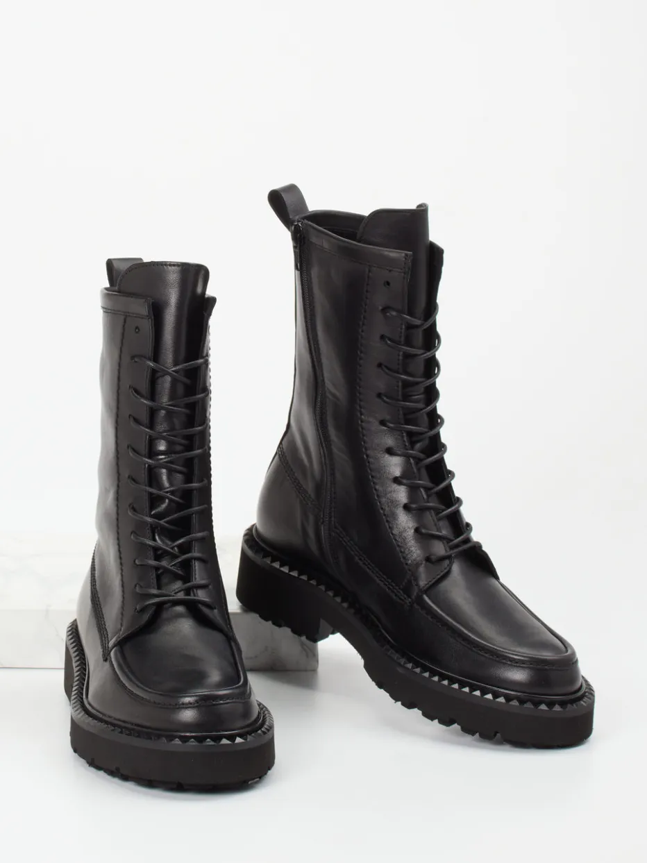 Diese kompakt geschnittenen Schnürboots überzeugen durch hochwertiges Kalbleder, funktionale Details und eine profilierte Sohle im Utility-Stil. Modernes Design trifft auf langlebige Verarbeitung.