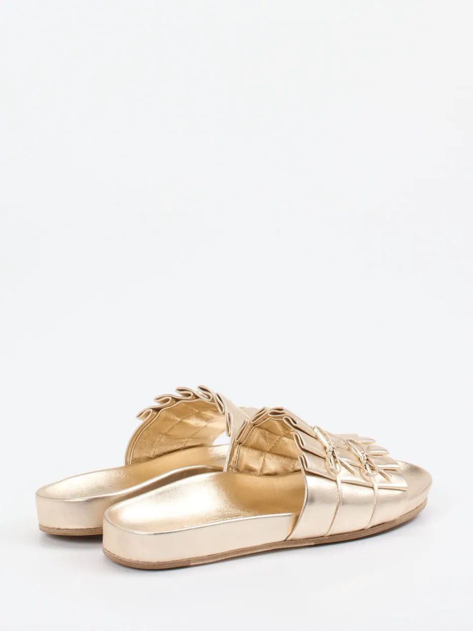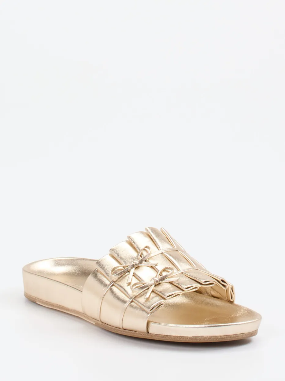 Die goldfarbenen Slides verbinden italienisches Kalbleder mit femininer Raffinesse. Feine Schleifen und glänzender Metallic-Look setzen moderne Akzente.