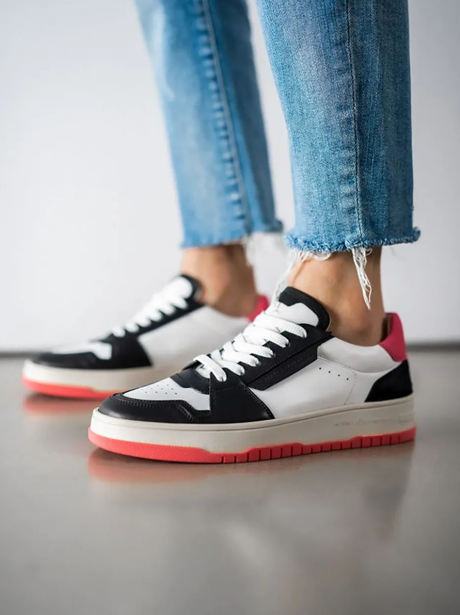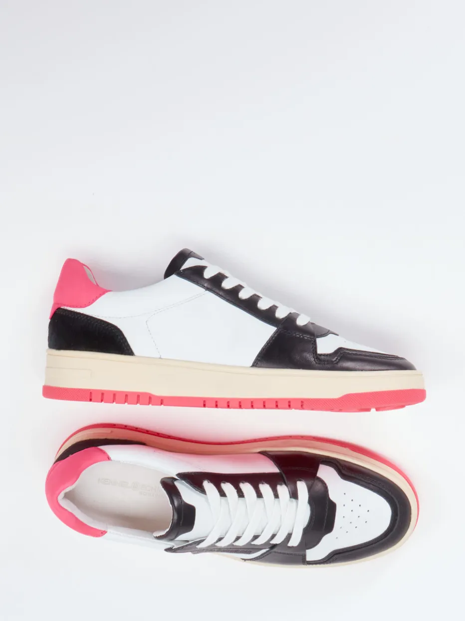Ideal für Alltag und Ausgehen bietet der Sneaker durch gepolsterte Lasche und komfortables Fußbett angenehmen Tragekomfort. Gefertigt aus weißem Kalbleder mit samtig wirkenden Akzenten, zeigt er markante Overlays in Schwarz und eine profilierte Sohle mit pinkem Kontrasteffekt – ein klares Highlight der Streetwear-inspirierten Silhouette. Der Schnürverschluss ergänzt das sportlich-dynamische Design. Farblich abgestimmte Details unterstreichen den Color-Blocking-Trend der kommenden Saison. Perfekt zu Oversized Hoodies oder monochromen Outfits.