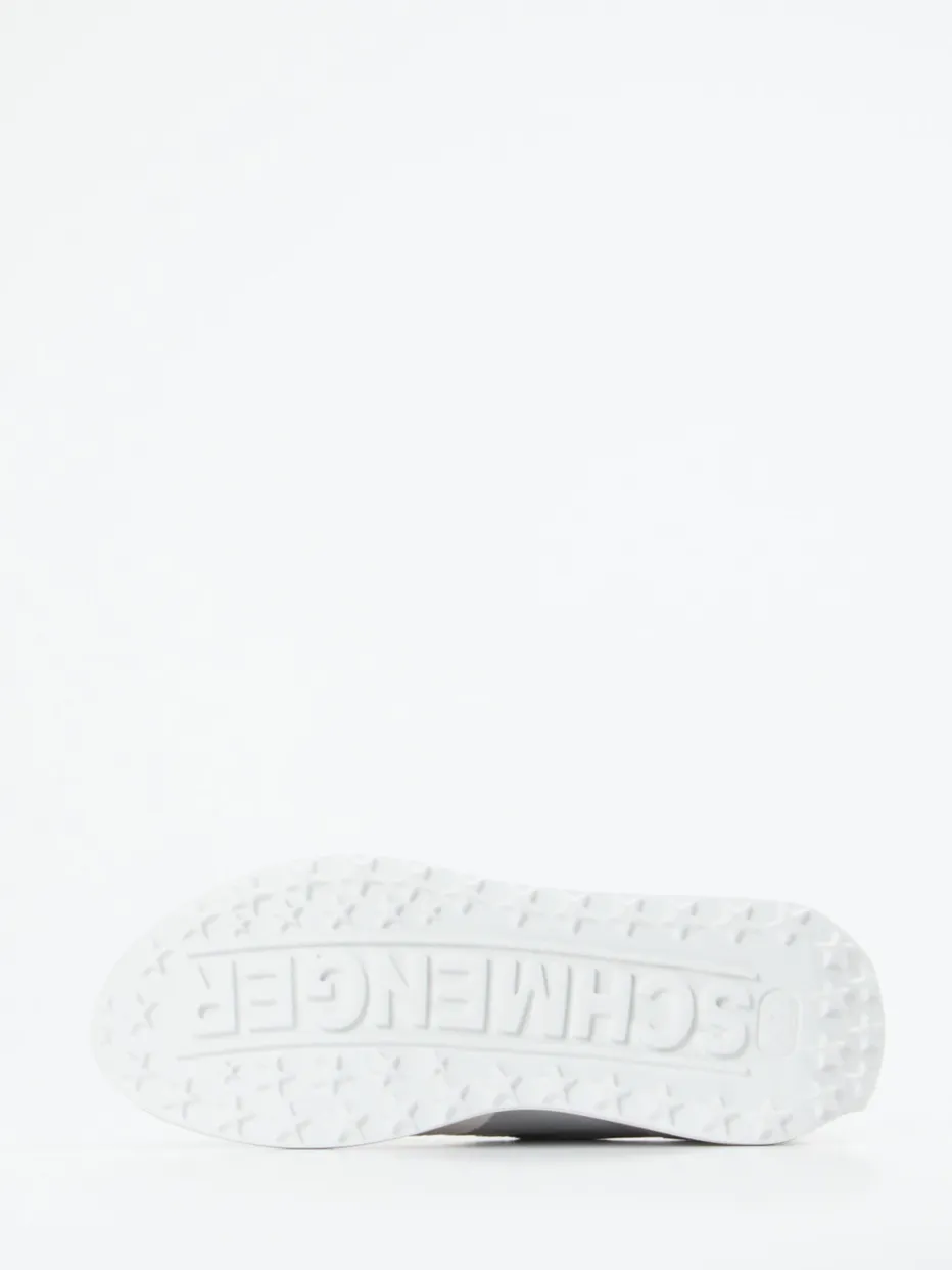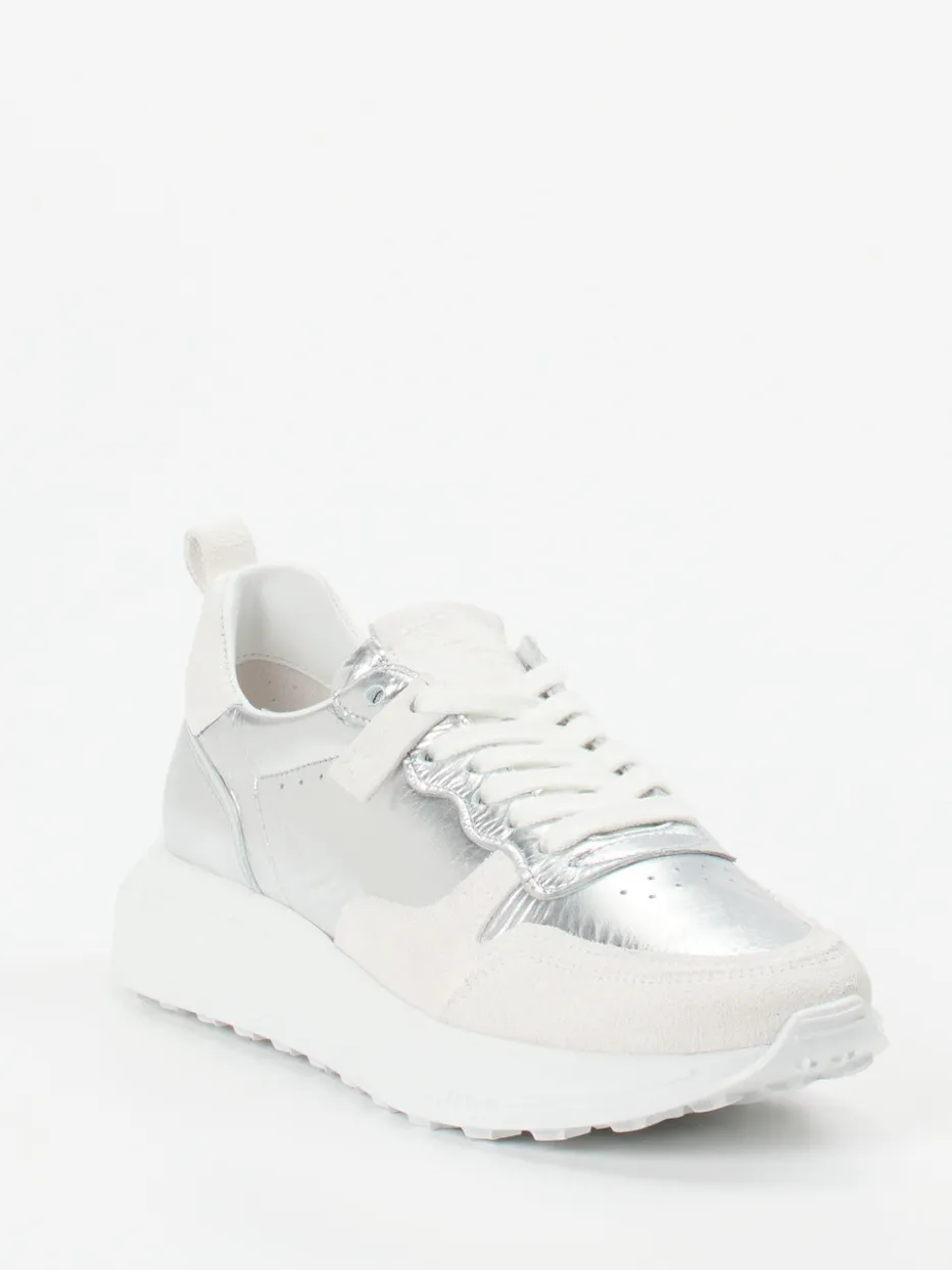 Silber trifft Komfort in futuristischer Form.Kennel & Schmenger präsentiert mit diesem Damen-Sneaker ein progressives Modell im Metallic-Look. Für urbane Momente mit modischem Anspruch bietet der Sneaker durch sein hochwertiges, silberfarbenes Metallicleder mit samtigem Veloursleder-Overlay eine besondere Materialtiefe. Der sportlich-voluminöse Schnitt mit gepolsterter Zunge, Ton-in-Ton-Schnürung und markanter Zuglasche steht ganz im Zeichen des Chunky-Sneaker-Trends. Die robuste, weiße Gummisohle mit dezentem Branding sorgt für Tragekomfort und ein sicheres Laufgefühl im Alltag oder beim Ausgehen. Streetwear-Einflüsse und eine klar strukturierte Silhouette machen das Design vielseitig kombinierbar – etwa mit weißen Oversized-Jacken. Ein progressiver Alltagsbegleiter mit trendigem Metallic-Finish und komfortabler Ausstattung.