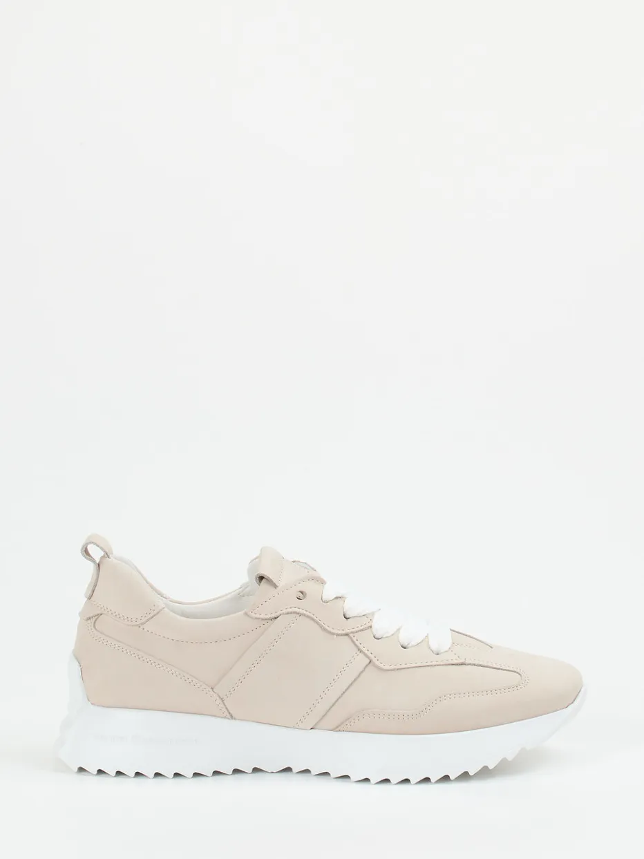 Ideal für den modernen Alltag, überzeugt dieses Modell durch seine samtig angeschliffene Nubukleder-Oberfläche und ein sportlich-dynamisches Design. Die dominante Sandbeige-Farbgebung unterstreicht den minimalistischen Charakter, während breite weiße Schnürbänder und eine auffällige Chunky-Profilsohle kontrastreiche Akzente setzen. Geprägtes Branding und eine rückseitige Zuglasche vervollständigen den Look. Das angenehm gepolsterte Ziegenlederfutter und die Einlagenfreundlichkeit bieten hohen Tragekomfort. Stilistisch ist der Sneaker dem Quiet-Luxury-Trend zuzuordnen.