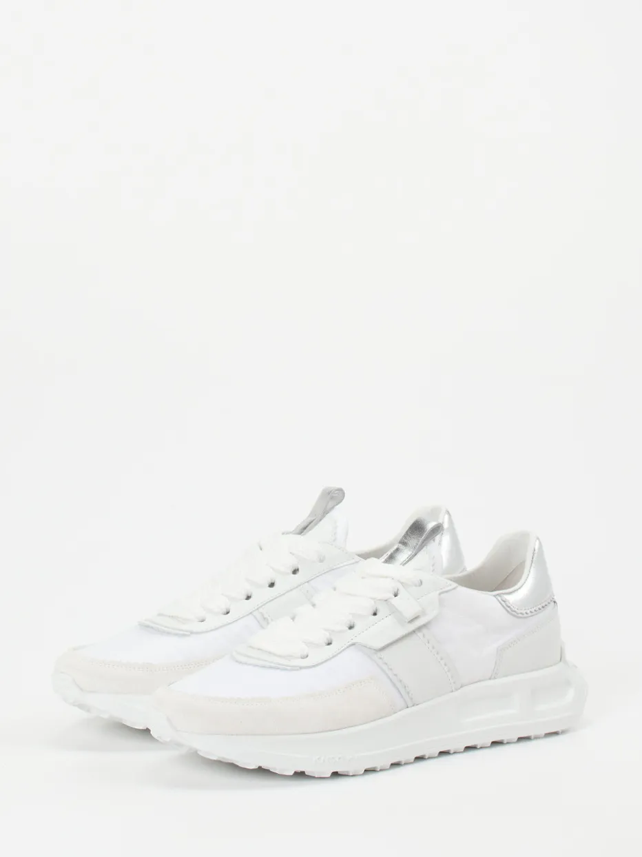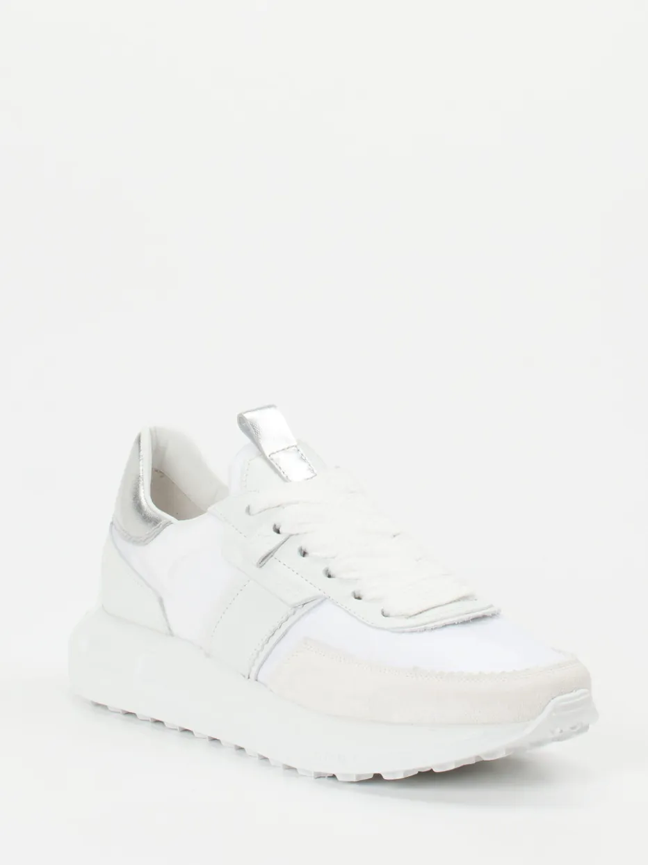 Ein sportlich-eleganter Sneaker mit innovativem Materialmix aus Veloursleder und Textil. Metallic-Akzente in Silber setzen einen subtilen Trendakzent für die kommende Saison.