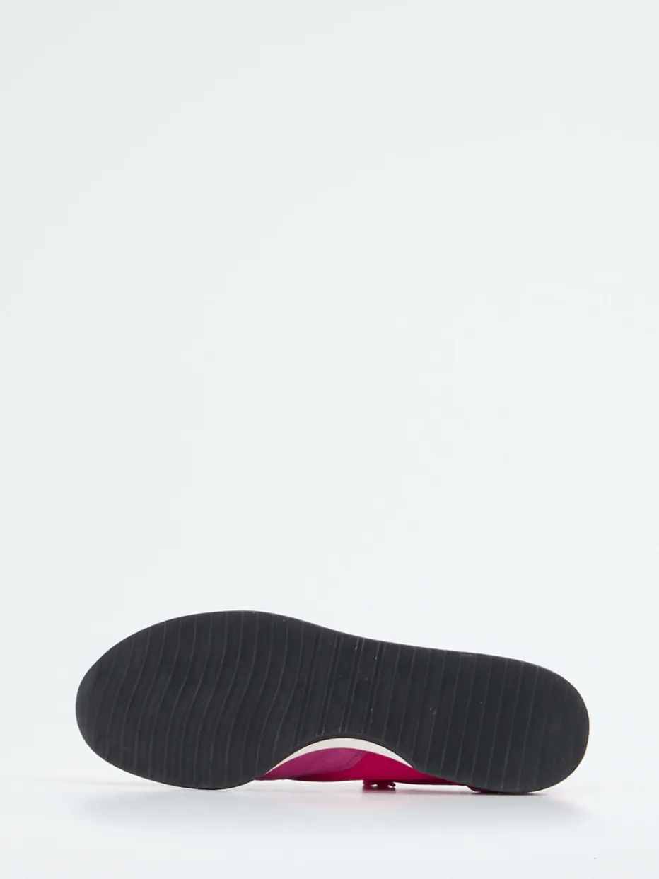 Ob beim entspannten Stadtbummel oder auf Reisen – das Modell überzeugt mit einem Materialmix aus pinkem Veloursleder, samtig angeschliffen, und tonigem Nylon. Die flache, sportliche Silhouette wird durch das seitliche Stern-Emblem, den gepolsterten Schaftrand und die Farbgebung in Fuchsia Pink modern inszeniert. Eine mehrfarbige Gummisohle mit Rillenprofil sorgt für Stoßdämpfung und Rutschhemmung. Der Style ist stark vom Streetwear- und Y2K-Trend beeinflusst und lässt sich perfekt zu weißen Socken und Crossbody-Bag kombinieren.
