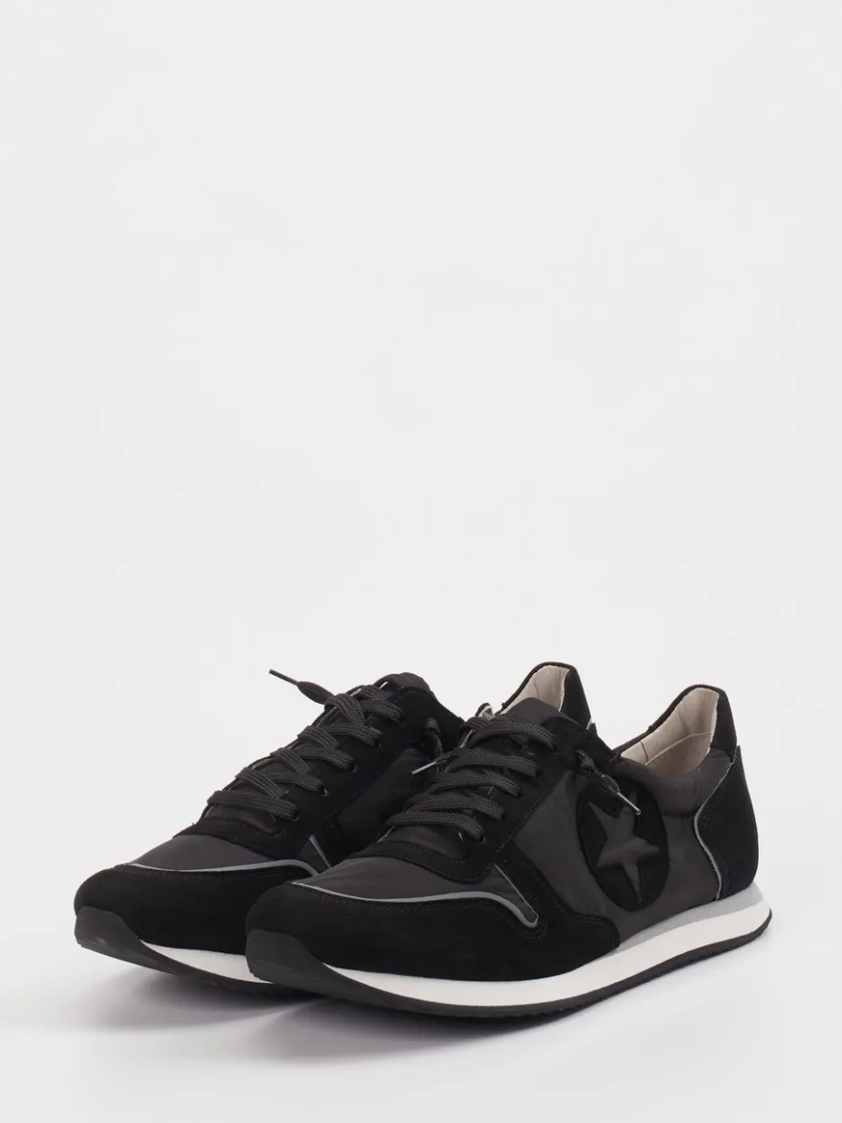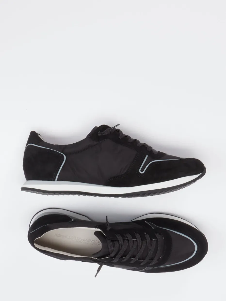 Monochromer Stil, moderner Komfort. Kennel & Schmenger präsentiert einen Damen-Sneaker im Retro-Runner-Stil, der sportliche Eleganz mit subtilen Details vereint. Ob für einen Stadtbummel oder entspannte Stunden zu Hause – das Modell aus mattem Veloursleder und Textil überzeugt durch seinen monochrom-schwarzen Look mit tonaler Stern-Applikation und reflektierenden Paspeln. Die schlanke Silhouette, eine komfortable Polsterung und die griffige Gummisohle bieten einen urbanen Mix aus Style und Funktionalität. Inspiriert von Streetwear und „Quiet Luxury“-Trends passt der Sneaker optimal zu cleanen Outfits oder lässigen Basics. Markentypischer Anspruch an Design und Passform geben diesem Sneaker seinen besonderen Alltagswert.