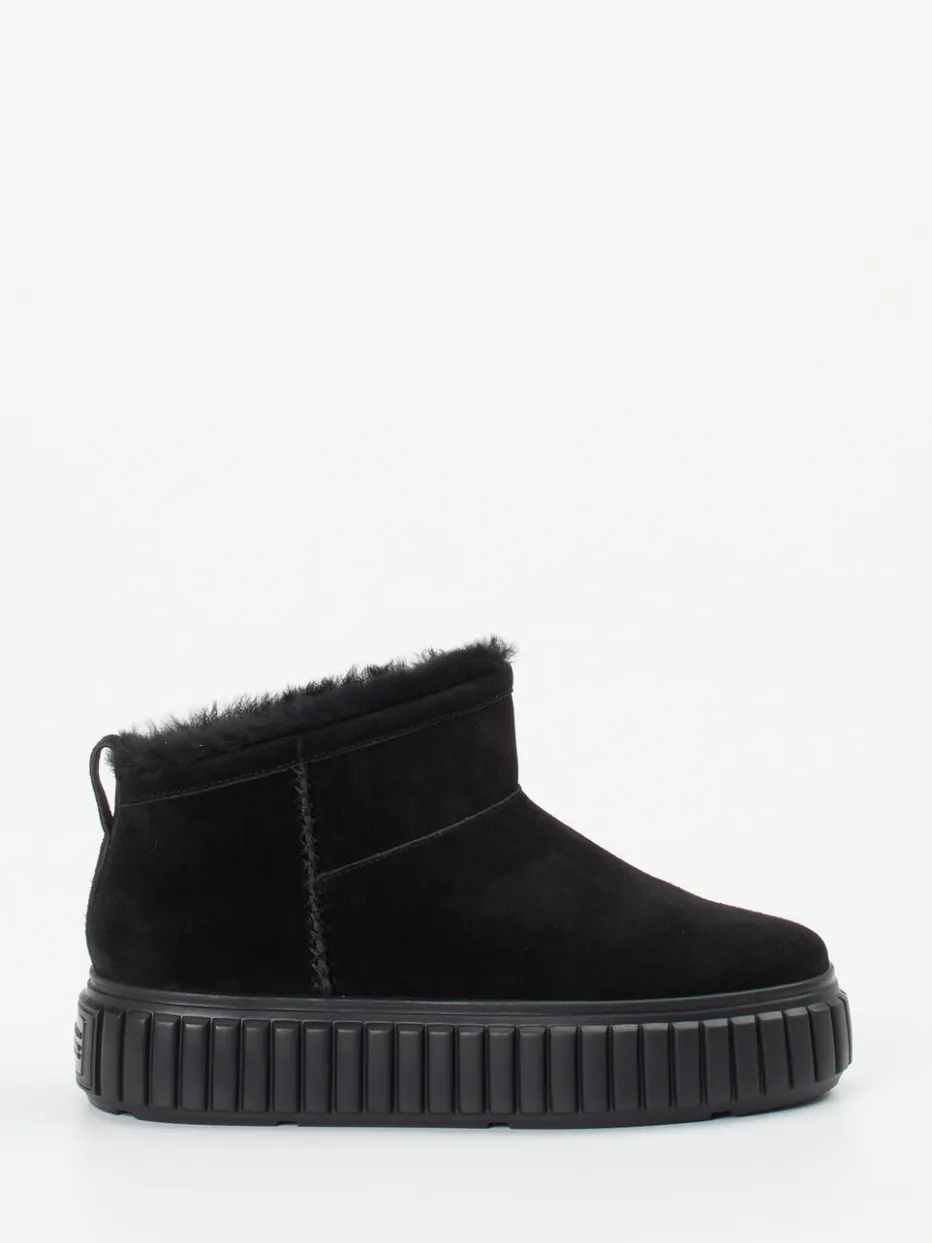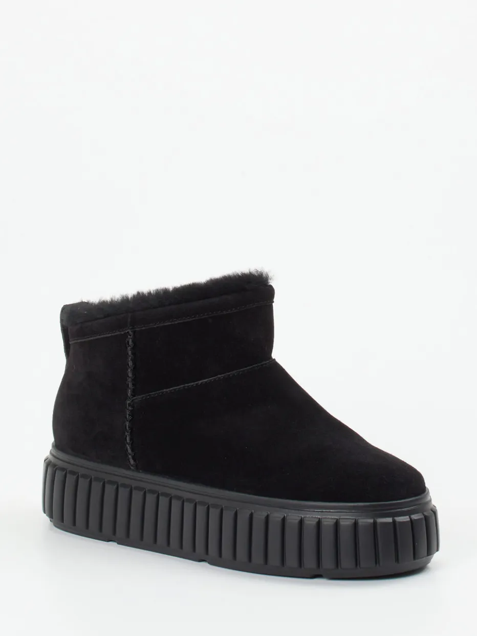 Gefertigt aus samtigem Veloursleder und warmem Lammfellfutter eignet sich diese Stiefelette ideal für kalte Wintertage. Die strukturierte Chunky-Sohle verleiht ihr eine moderne, urbane Note.