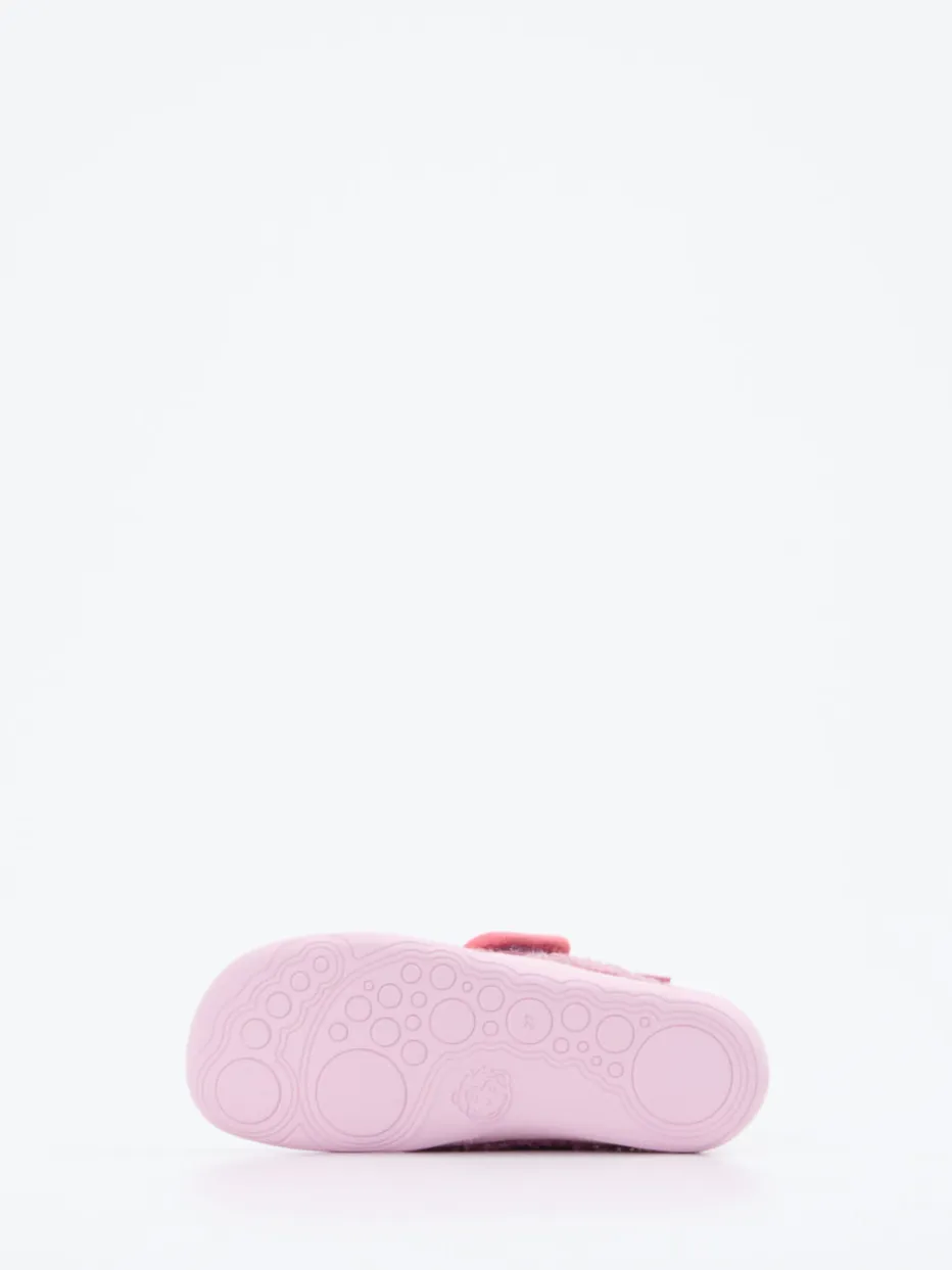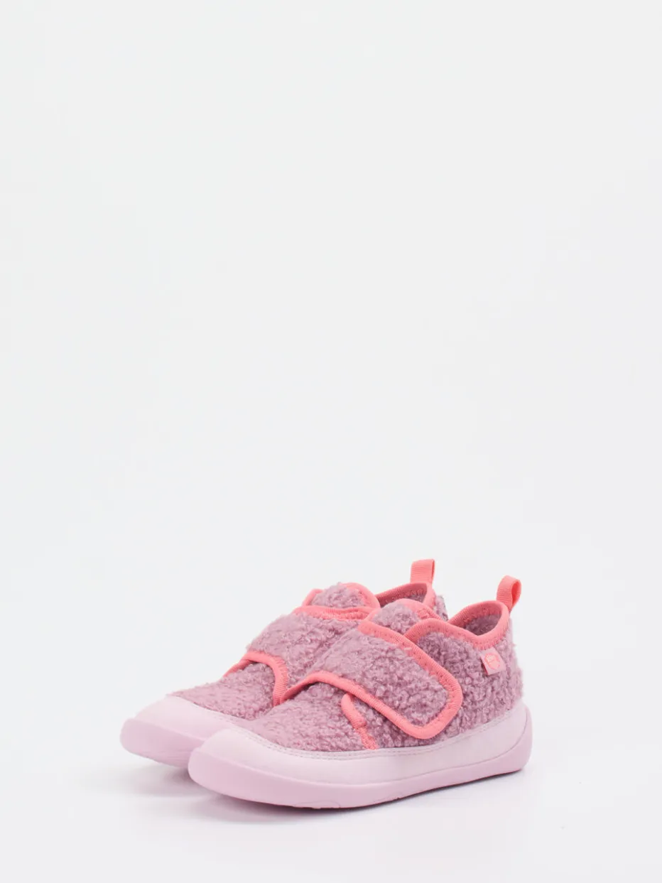 Behaglichkeit für kleine Füße.Die Marke Affenzahn zeigt mit diesen Kinder-Hausschuhen, wie Komfort und Design Hand in Hand gehen. Für gemütliche Stunden daheim bietet das Modell mit flauschigem Bouclé-Textil in sanftem Altrosa einen kuschelig-weichen Einstieg. Der Klettverschluss erleichtert das An- und Ausziehen, während die kompakte Form und die stabile, rutschhemmende Gummisohle sicheren Halt auf allen Innenbodenarten bietet. Tonale Paspelierungen in Koralle setzen liebevoll Akzente und unterstreichen die skandinavisch inspirierte Leichtigkeit des Designs. Ein farblich integriertes Logo und eine Zuglasche am Fersenbereich runden den Look zweckmäßig ab. Perfekt abgestimmt auf entspannte Loungewear in der kühlen Jahreszeit – mit bewährter Affenzahn-Funktionalität.