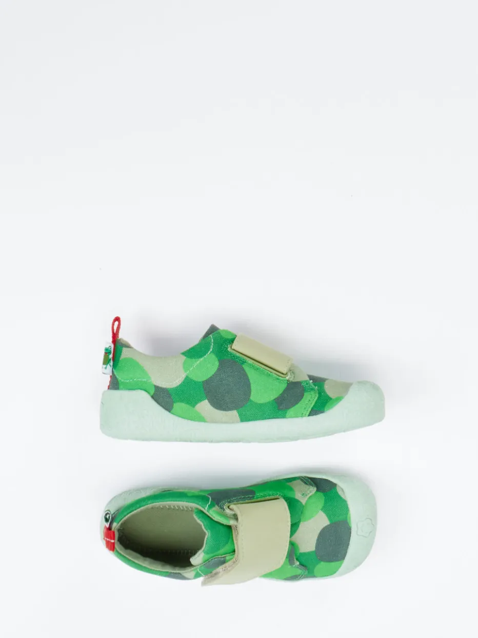 Stilvoll unterwegs auf kleinen Füßen.Die Marke Affenzahn bietet hier modische Krabbelschuhe für Kinder. Ob für erste Schritte im Wohnzimmer oder auf Erkundungstour im Garten – diese Lauflernschuhe aus strapazierfähigem Canvas mit matter Oberfläche bieten sicheren Halt dank profilierter Gummisohle und praktischem Klettverschluss. Das Design überzeugt durch ein modernes Camouflage-Muster in Grasgrün, Salbeigrün und Dunkeloliv, ergänzt durch rote Fersenlaschen und eine geprägte Logo-Seite. Die runde, flache Form und das weiche Textilfutter sorgen für Komfort im Alltag. Inspiriert von Streetwear und Outdoor-Styles setzen die Schuhe modische Akzente im Kinderlook. Durchdachtes Design mit nachhaltigem Ansatz von Affenzahn.