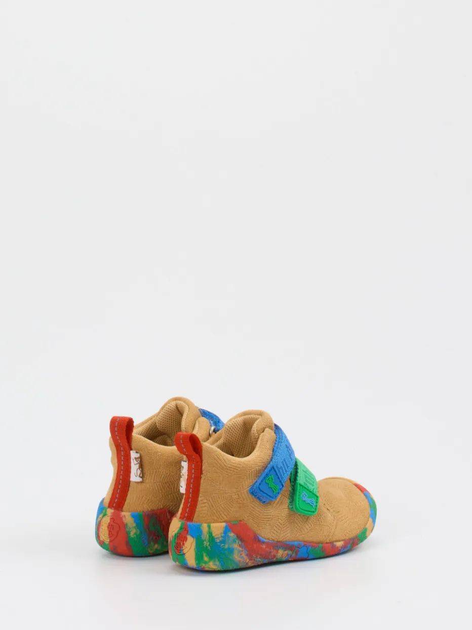 Ob drinnen oder draußen – das strukturierte Veloursleder sorgt für ein angenehm weiches Tragegefühl, während die farbenfrohe Gummisohle mit Farbklecks-Optik sicheren Halt bietet. Die kompakte, runde Form, kombiniert mit doppeltem Klettverschluss und rückseitiger Zuglasche, unterstützt kleine Füße optimal bei jedem Schritt. In Sandbeige mit Akzenten in Kobaltblau und Grasgrün harmonieren sie perfekt mit verspielter Kinderkleidung. Der Look greift das Color-Blocking-Trendthema auf – ideal für Freizeit und Entdeckungstouren.