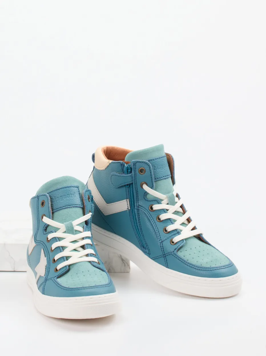Trendstarkes Design trifft Retro-Charme.Bisgaard zeigt mit diesem High-Top Sneaker für Kinder eine verspielte Neuinterpretation des Y2K-Stils. Ob beim Stadtbummel oder Geburtstagsfeier – dieser Sneaker sorgt für stylischen Auftritt. Gefertigt aus hochwertigem Lammleder mit genarbter Oberfläche, kombiniert er türkisblauen Glattlederbesatz mit mintgrünen Veloursdetails. Ein seitlicher Reißverschluss ergänzt die sportliche Schnürung funktional, während Ziernähte und eine Labelprägung auf der Zunge den Look abrunden. Die rutschfeste Gummisohle bietet Alltagstauglichkeit, das Design trifft den aktuellen Pastell- und Streetwear-Trend. Lässt sich besonders gut zu Jeans, Shorts oder leichten Sommerkleidern kombinieren. Komfort, Qualität und Stil – im typischen Bisgaard-Design vereint.