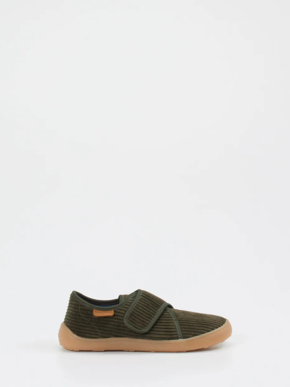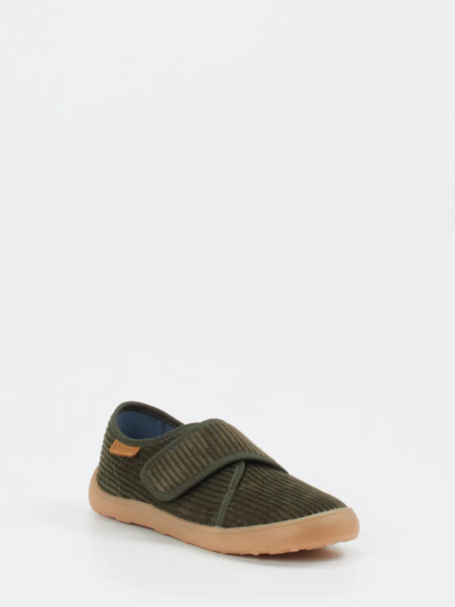 Der Klett-Hausschuh verbindet strukturierten Cordstoff mit einer flexiblen Gummisohle und sorgt so für sicheren Halt und angenehmen Komfort bei jedem Schritt.