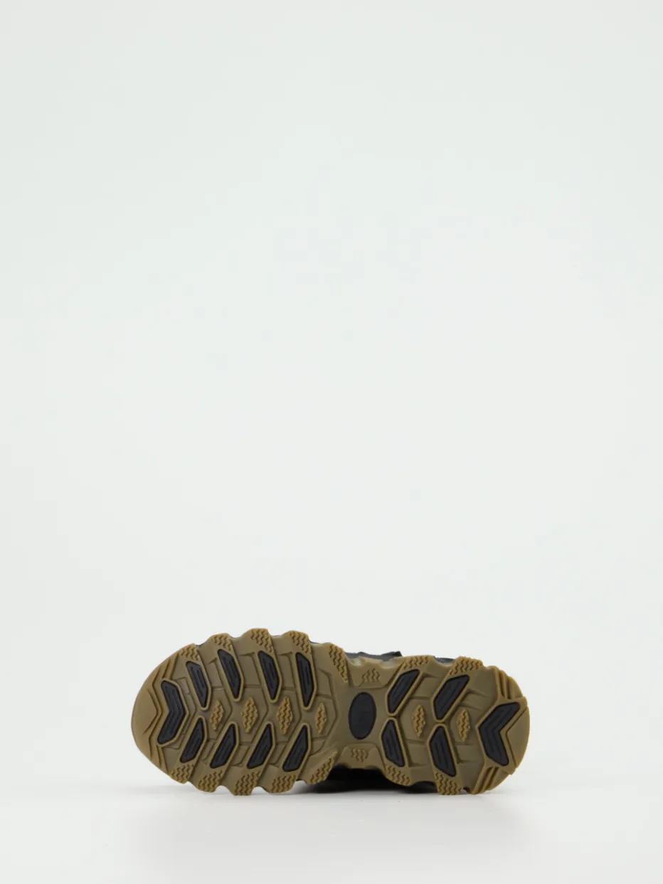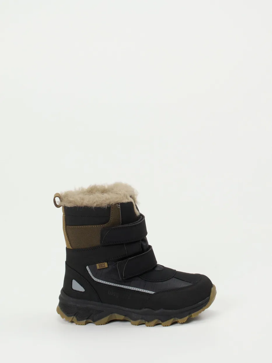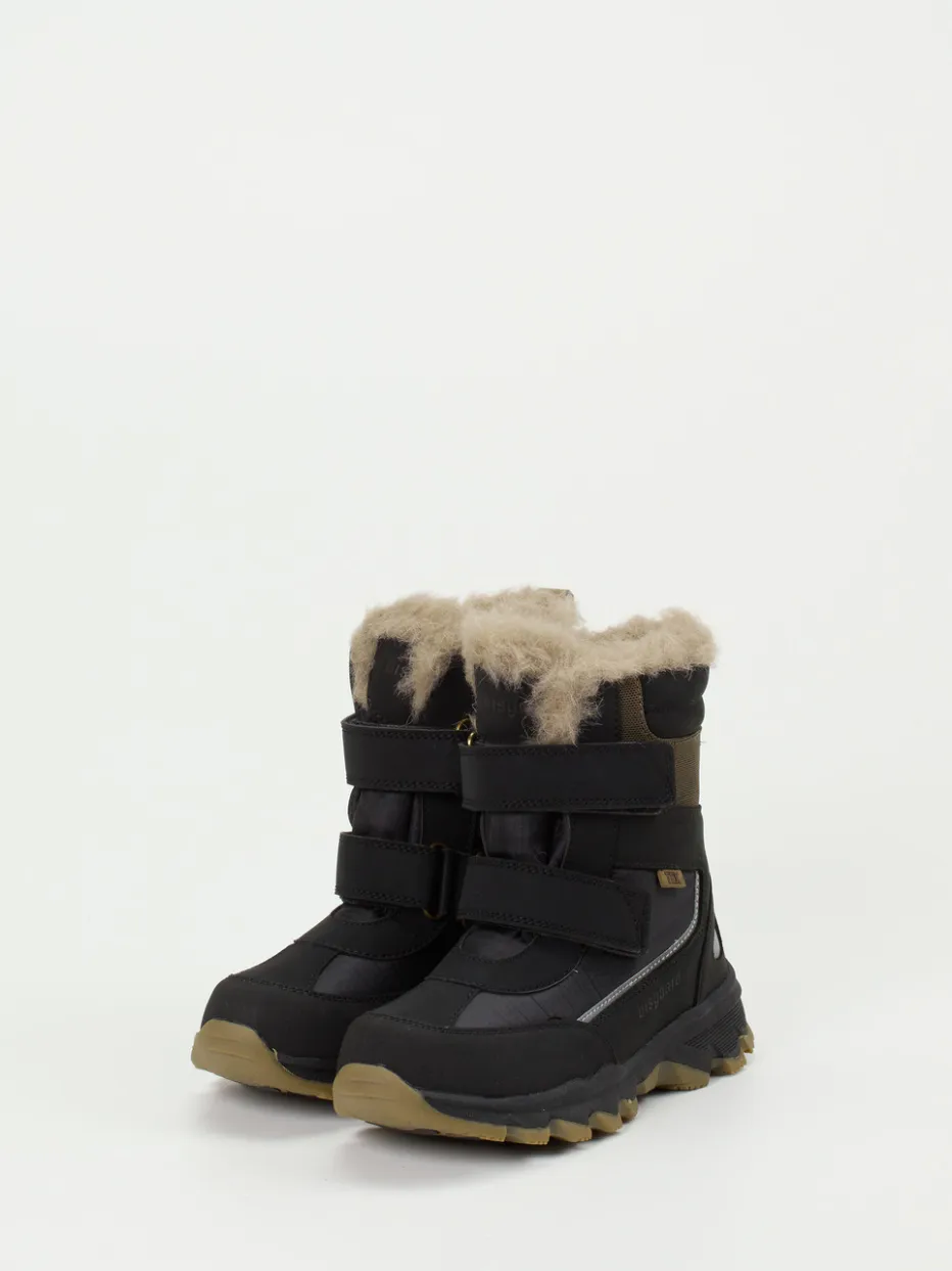 Wärme und Halt für Winterabenteuer.Bisgaard präsentiert schwarzfarbene Klettboots für Kinder mit robustem Winterdesign. Ob beim Spielen im Park oder auf dem Schulweg – die hoch geschnittenen Boots aus Nubukleder mit samtig angeschliffener Oberfläche bieten Schutz und Komfort. Das Innenfutter aus Lammwolle hält zuverlässig warm, während das kunstfellgefütterte Finish und die reflektierenden Elemente für Sicherheit sorgen. Der Klettverschluss ermöglicht ein kinderleichtes An- und Ausziehen. Optische Akzente setzen die zweifarbige Gummisohle mit griffigem Profil sowie kontrastierende Details in Braun und Beigegrau, inspiriert vom Utility-Stil. Perfekt kombinierbar mit Thermohosen und Outdoor-Jacken. Ein Schuh mit funktionalem Designanspruch – kindgerecht und wintertauglich zugleich.