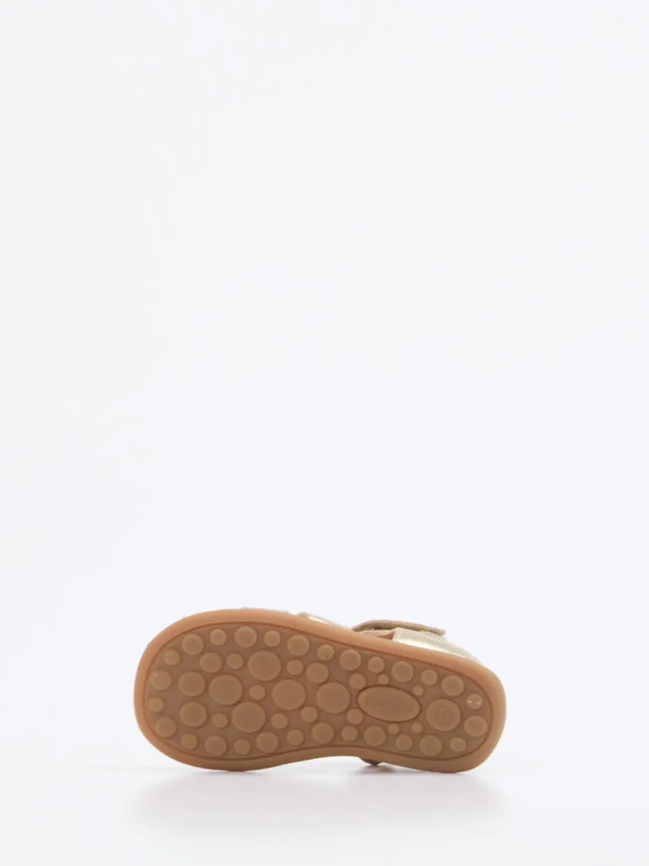 Glanzstück für kleine Schritte.Bisgaard präsentiert mit dieser Sandale ein hochwertiges Modell für Kleinkinder. Ideal für warme Tage in der Freizeit oder im Urlaub: Das Modell aus Metallicleder überzeugt mit samtigem Glanz in Gold und einer geschlossenen Silhouette mit Cut-Outs. Die flexible Gummisohle mit rutschhemmendem Profil unterstützt sicheres Laufen, während der praktische Klettverschluss einen problemlosen Einstieg ermöglicht. Dezente Ton-in-Ton-Nähte und eine feine Markenprägung im Fußbett runden das Design harmonisch ab. Der Look erinnert an minimalistische Retro-Kindermode und passt besonders gut zu Sommerkleidung aus Naturmaterialien. Ein stilvoller Begleiter im Alltag – komfortbetont und trendbewusst zugleich.