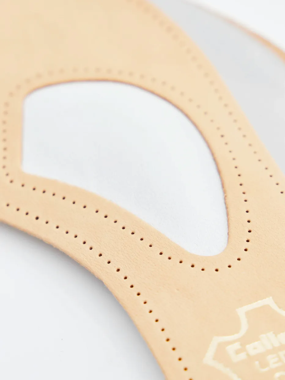 Diese Einlage der Marke Collonil besteht aus pflanzlich gegerbtem Leder und enthält ein Schaumstoffpolster sowie eine praktische Klebefixierung. Sie sorgt für eine spürbare Unterstützung und Entlastung des Quer- und Längsgewölbes des Fußes. Aus hygienischen Gründen ist der Umtausch ausgeschlossen.