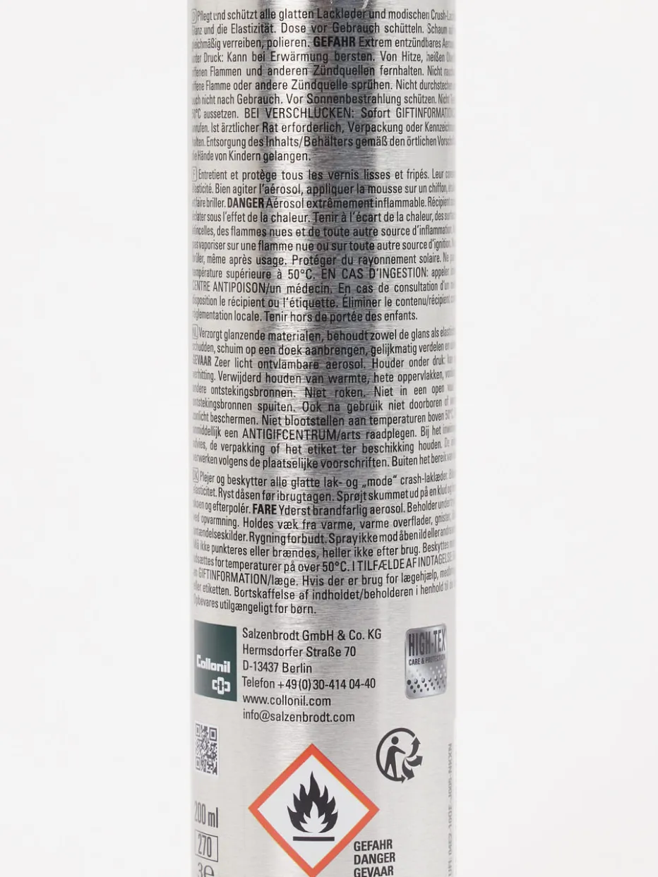 Das Lack Mousse von Collonil schützt und pflegt alle glatten Lackleder und Leder in modischer Craquelé Optik. Es erhält den Glanz und unterstützt die Elastizität. – Geeignet für: Lackleder – Größe: 200 ml (59,75 € / 1 L) – Anwendung: Gut schütteln, Schaum auf ein Tuch geben, gleichmäßig verreiben, polieren Warnhinweise: GEFAHR Extrem entzündbares Aerosol. Behälter steht unter Druck: Kann bei Erwärmung bersten. Von Hitze, heißen Oberflächen, Funken, offenen Flammen und anderen Zündquellen fernhalten. Nicht rauchen. Nicht gegen offene Flamme oder andere Zündquelle sprühen. Nicht durchstechen oder verbrennen, auch nicht nach Gebrauch. Vor Sonnenbestrahlung schützen. Nicht Temperaturen über 50°C aussetzen. BEI VERSCHLUCKEN: Sofort GIFTINFORMATIONSZENTRUM/Arzt anrufen. Ist ärztlicher Rat erforderlich, Verpackung oder Kennzeichnungsetikett bereithalten. Entsorgung des Inhalts/Behälters gemäß den örtlichen Vorschriften. Darf nicht in die Hände von Kindern gelangen.