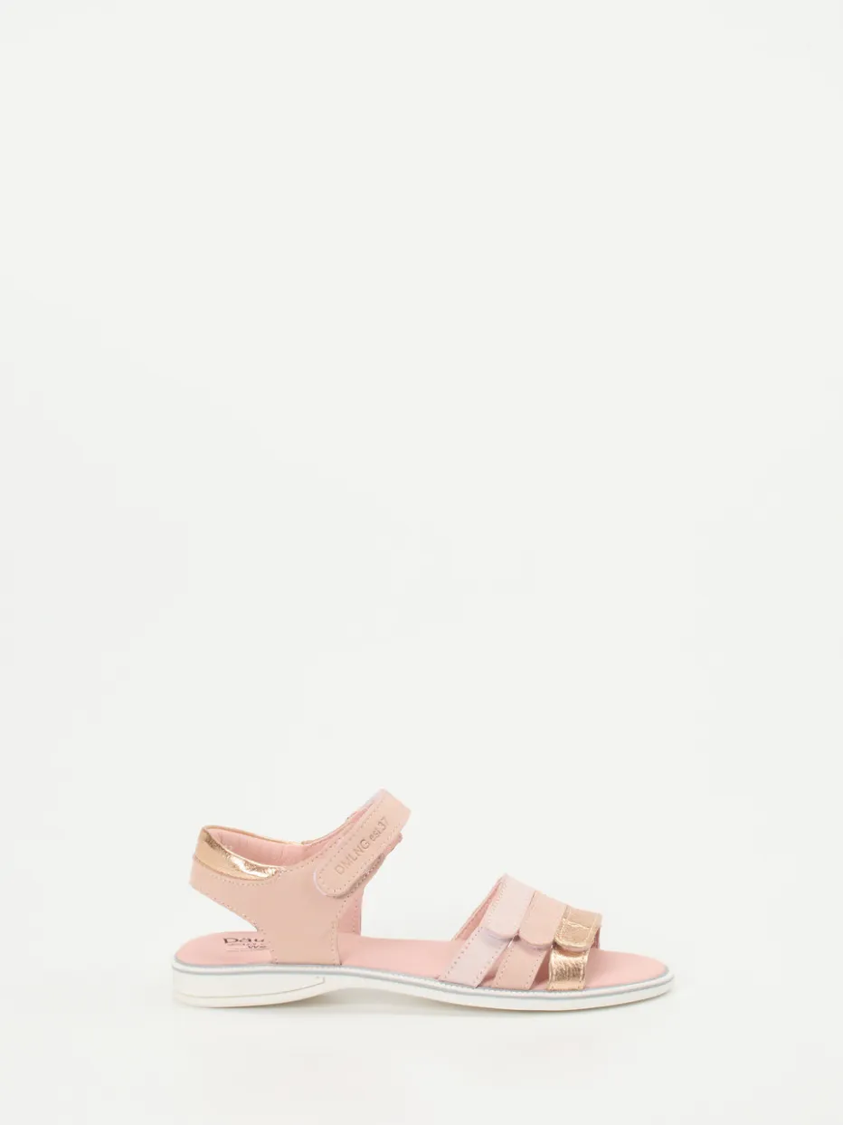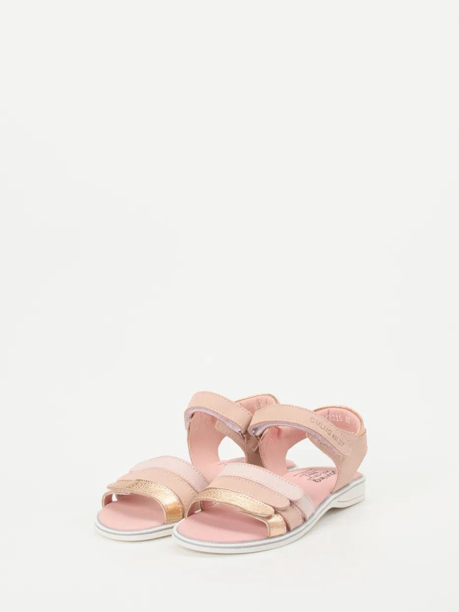 Glanzvolles Sommer-Update für kleine Füße.Die Marke Däumling präsentiert eine stilvolle Kindersandale für warme Saisons. Zielgerichtet für sommerliche Ausflüge und entspannte Urlaubstage überzeugt das Modell mit seinem anschmiegsamen Obermaterial aus Kalbleder, das samtig verarbeitet und angenehm atmungsaktiv ist. Der zarte Rosaton wird durch goldene Metallic-Riemen glänzend akzentuiert. Zwei praktische Klettverschlüsse ermöglichen ein schnelles Anpassen, während eine weich gepolsterte Decksohle und die ergonomisch geformte Gummisohle hohen Tragekomfort garantieren. Die offene Silhouette betont einen leichten, luftigen Stil im angesagten Soft-Pastell-Look. Mit Däumling Komfort und Design stilvoll vereint.