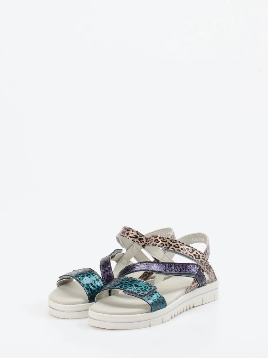 Expressiver Look für junge Trendsetterinnen.Däumling präsentiert stylische Klettsandalen für Kinder mit mutigem Designmix. Ob beim Stadtbummel oder Strandspaziergang – dieses Modell vereint angesagten Y2K-Charme mit alltagstauglicher Funktionalität. Gefertigt aus geprägtem Leder mit glänzender Oberfläche und Animalprint, ergänzt durch ein schimmerndes Metallic-Finish, setzen die farblich abgestuften Riemen lebendige Akzente in Cremeweiß, Petrol, Violett und Braun. Klettverschlüsse sowie eine leichte Gummisohle mit Profil bieten sicheren Halt und einfachen Einstieg. Die flache, offene Silhouette unterstreicht den verspielten Streetwear-Charakter. Ein farbstarker Sommerbegleiter mit bequemer Basis – ideal für expressive Styles mit Komfortanspruch.