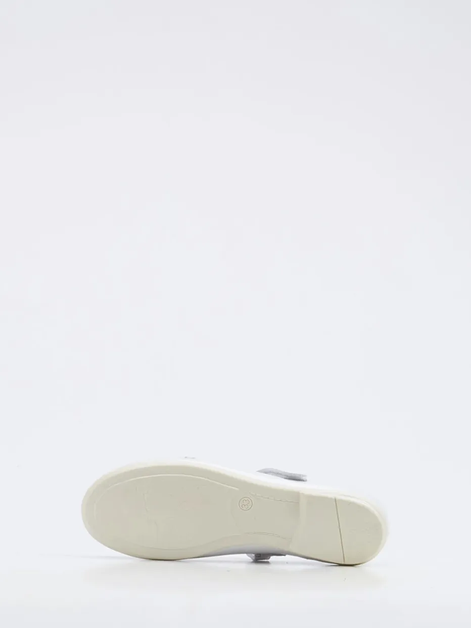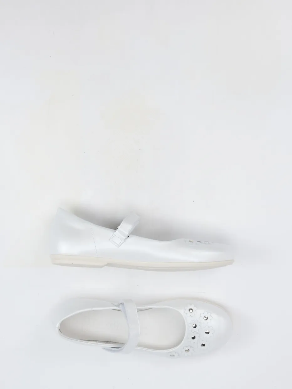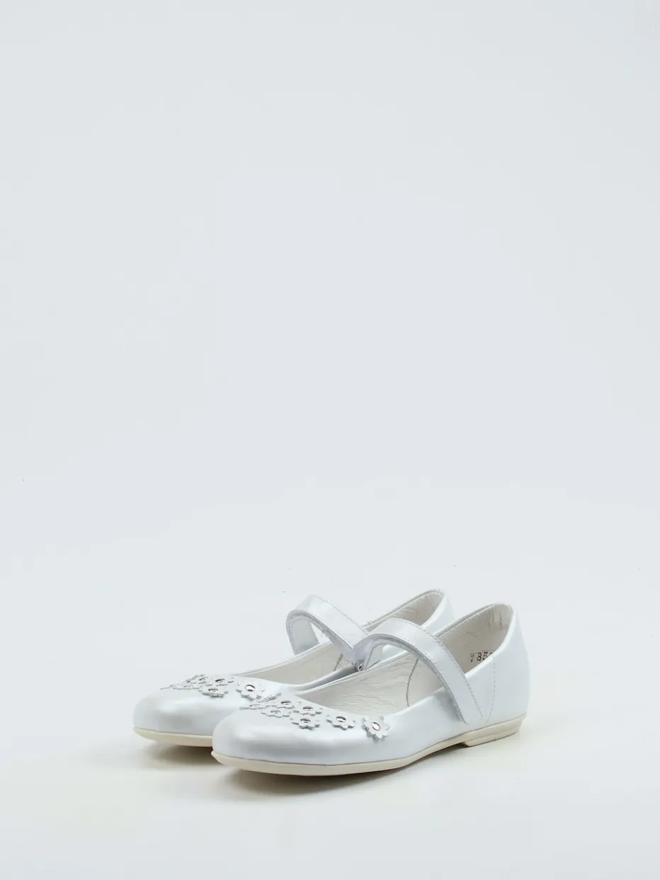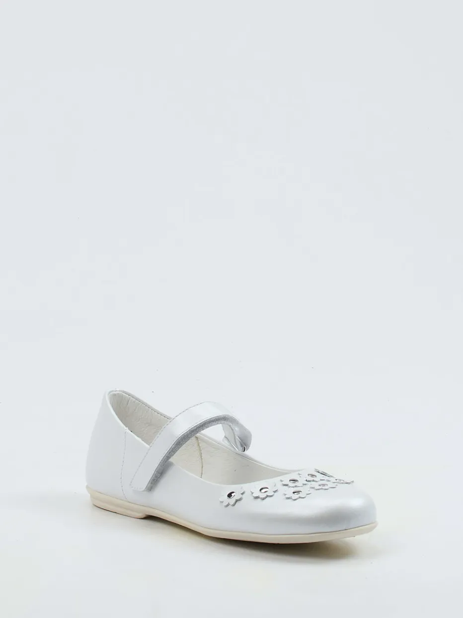Festliches Design für feierliche Anlässe.Däumling präsentiert diese eleganten Mary Jane Ballerinas für Kinder. Ideal für Hochzeiten, Taufen oder Familienfeiern überzeugen die Modelle durch ihr feines, perlweißes Kalbleder mit zart glänzender Oberfläche. Der klassische Rundschnitt und florale Applikationen mit silberfarbenen Nieten verleihen dem Design romantische Leichtigkeit. Mit praktischem Klettverschluss und verstärkter Fersenpartie bieten sie Sicherheit und Laufkomfort. Die flexible Gummisohle sorgt für guten Halt und unterstützt ein natürliches Abrollverhalten. Harmoniert besonders schön mit festlicher Kleidung in hellen Tönen. Komfort trifft bei Däumling auf liebevolle Detailgestaltung.