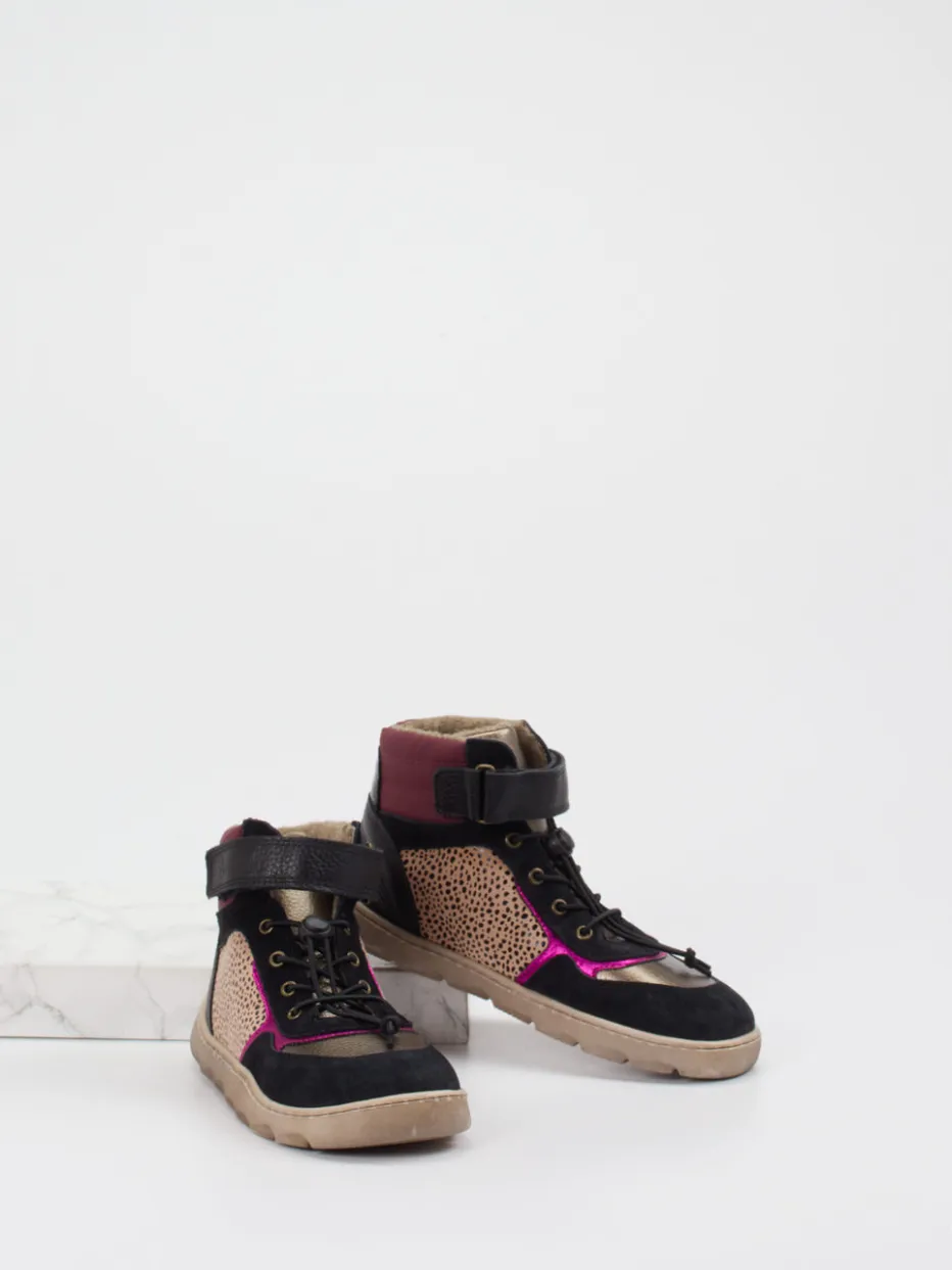 Für kleine Abenteurerinnen mit Stil.Die Marke develab präsentiert diese knöchelhohe Kinder-Stiefelette in High-Top-Silhouette. Ideal für herbstliche Wege zur Schule oder den Wochenendausflug überzeugt das Modell durch hochwertiges Veloursleder, samtig angeschliffen, kombiniert mit glattem und genarbtem Leder. Das warme Fleecefutter und eine profilierte Gummisohle bieten Komfort und Trittsicherheit. Die dominante schwarze Farbgebung wird trendig akzentuiert durch bordeauxrote Elemente, pink-goldene Metallic-Details und Animalprint-Strukturen. Klettverschluss und elastische Schnellschnürung ermöglichen kindgerechte Handhabung. Inspirierte Designelemente aus Streetwear und Outdoor machen das Modell besonders. Ein verlässlicher Begleiter mit markentypischer Passformqualität und kindgerechtem Look.